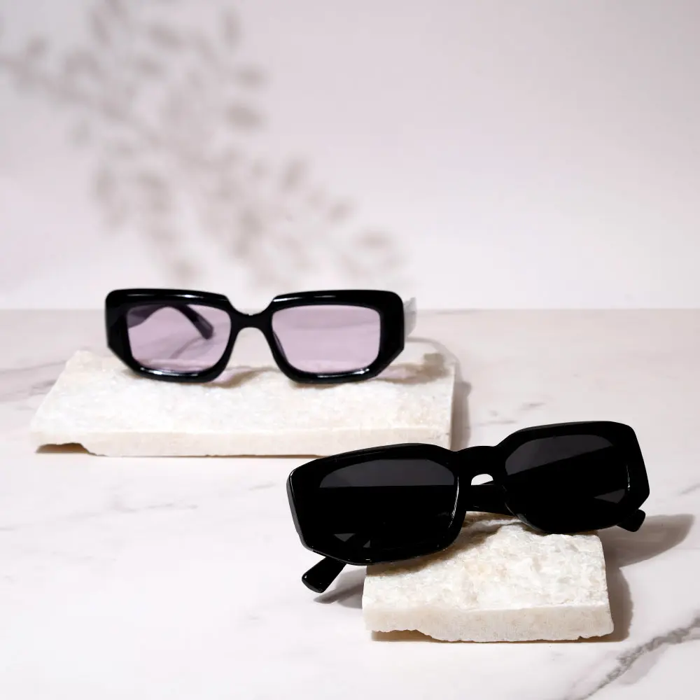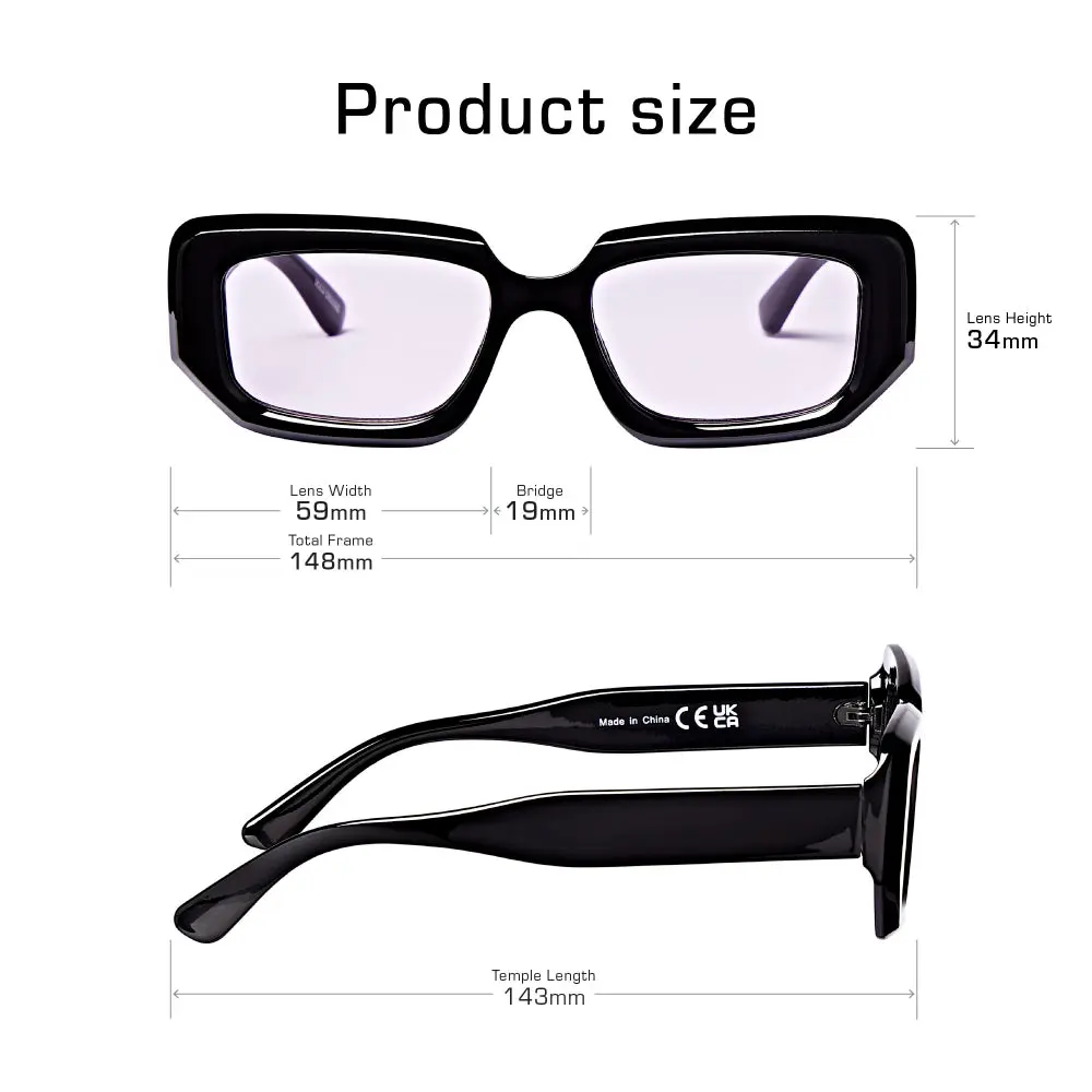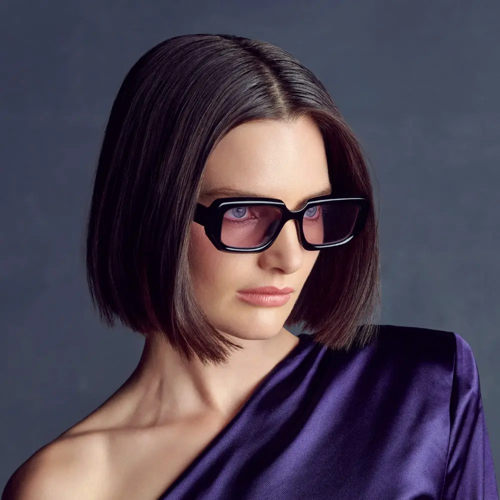 ·Style: Oversized black square frames with purple tint lens, saddle bridge