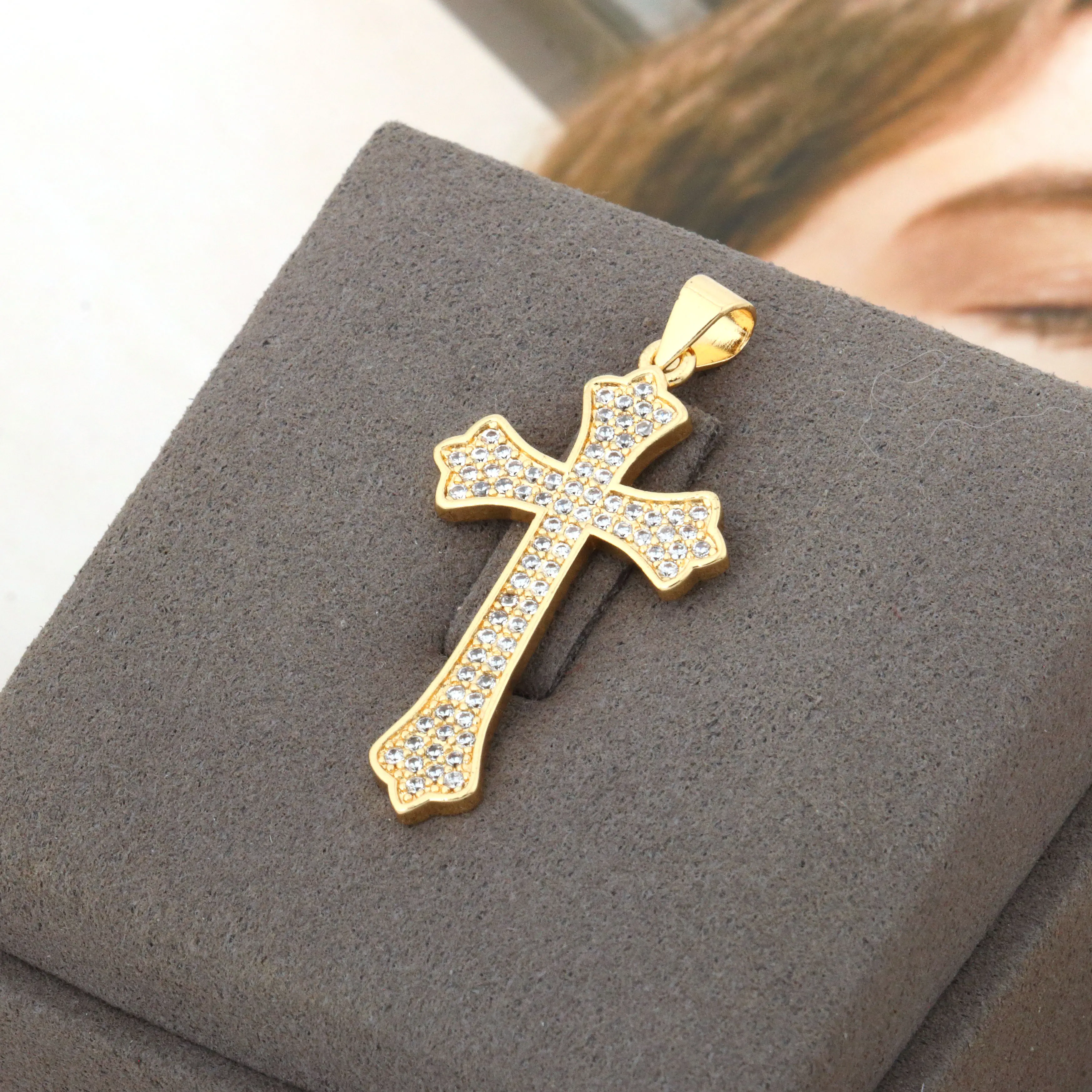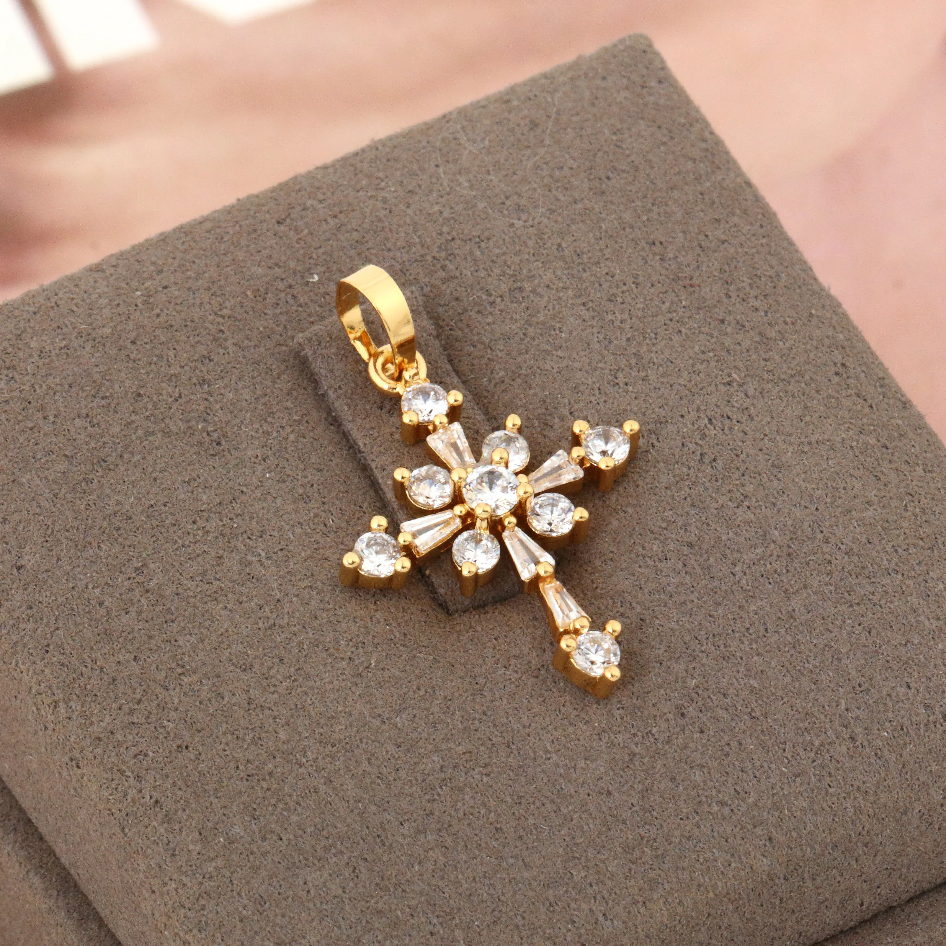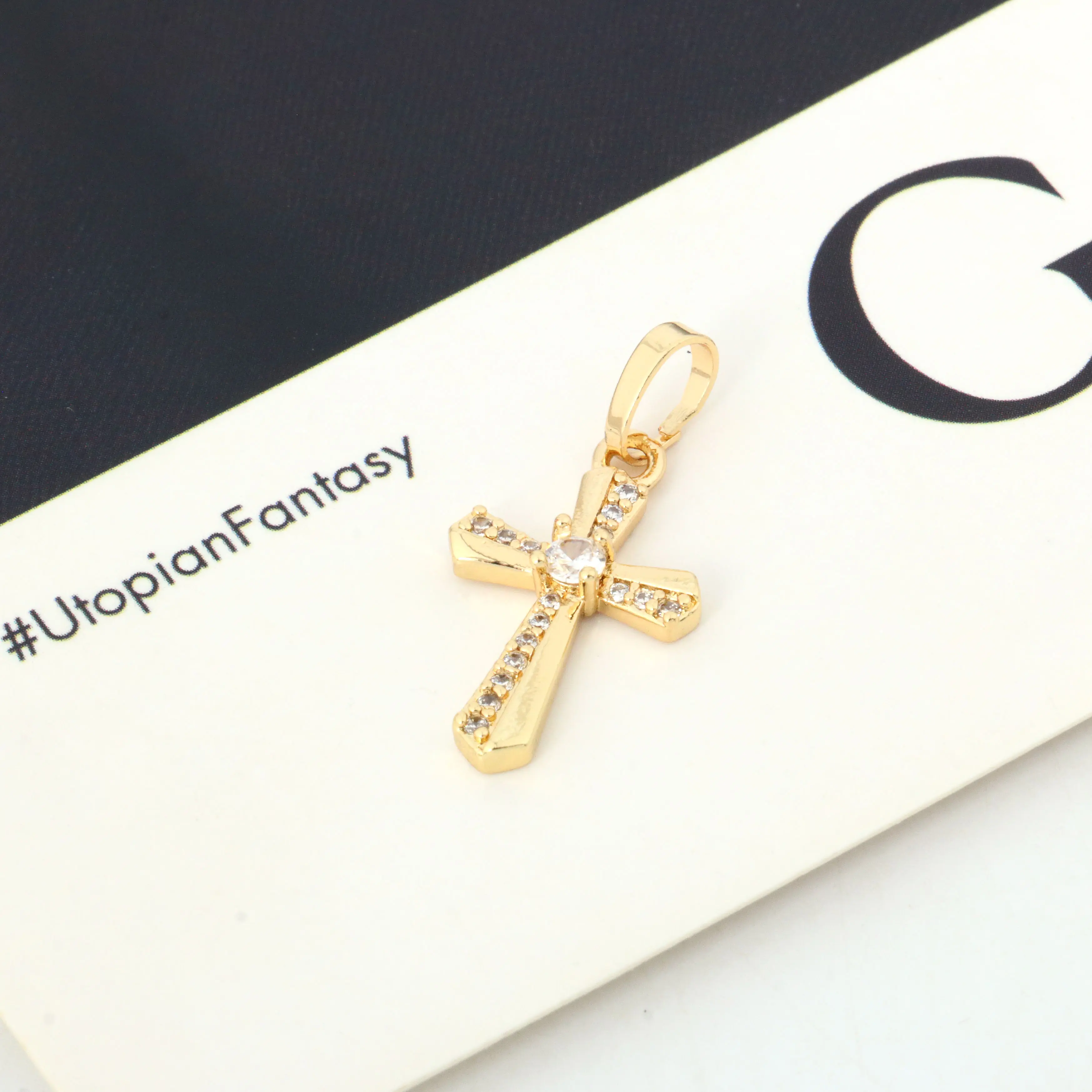 Trendy gold-plated cross charm pendant crafted from durable copper alloy, featuring sparkling zircon stones in a secure bezel setting. Designed for women, this stylish piece is perfect for DIY jewelry or everyday wear, adding a modern touch to any outfit. Every pendant comes with a necklace as a gift!