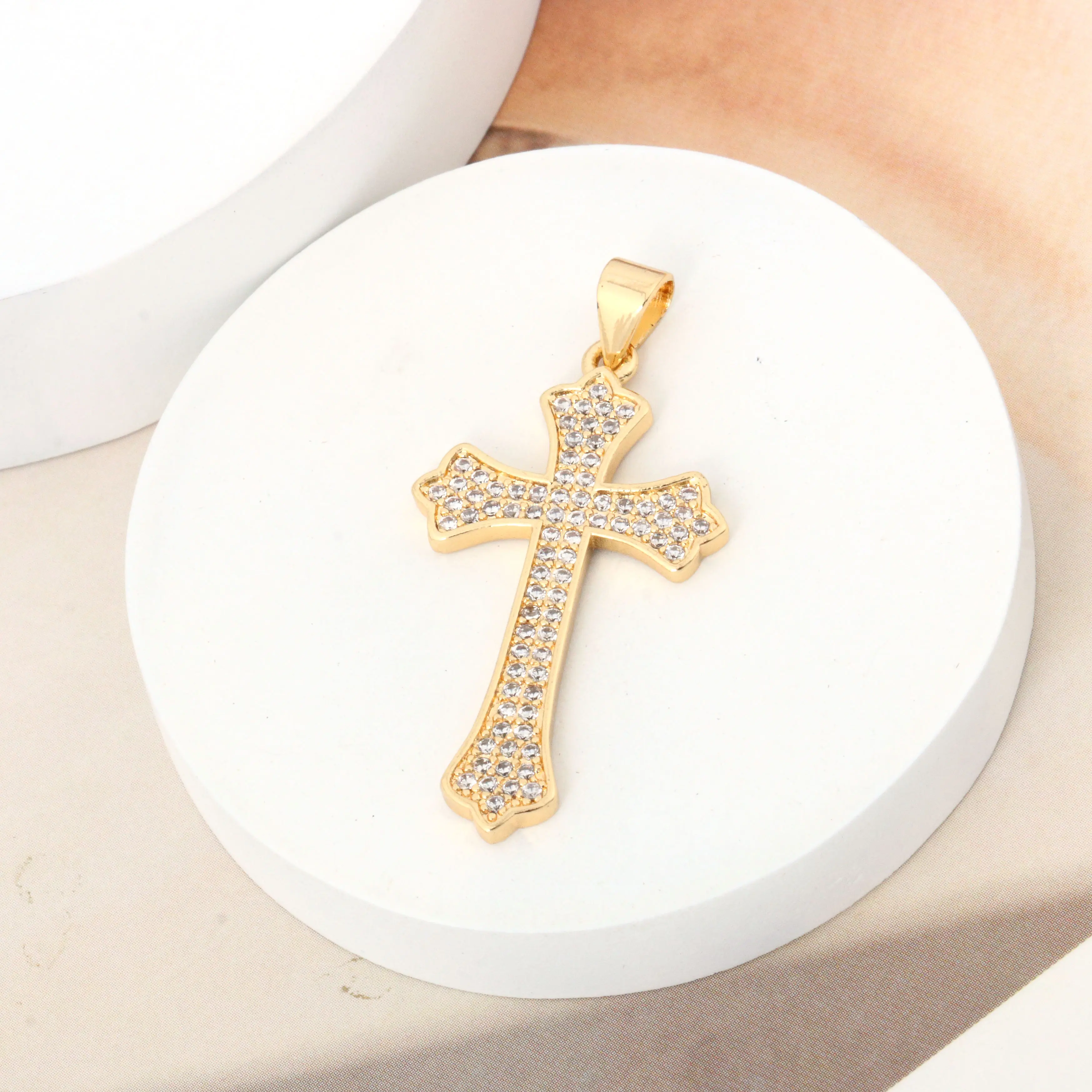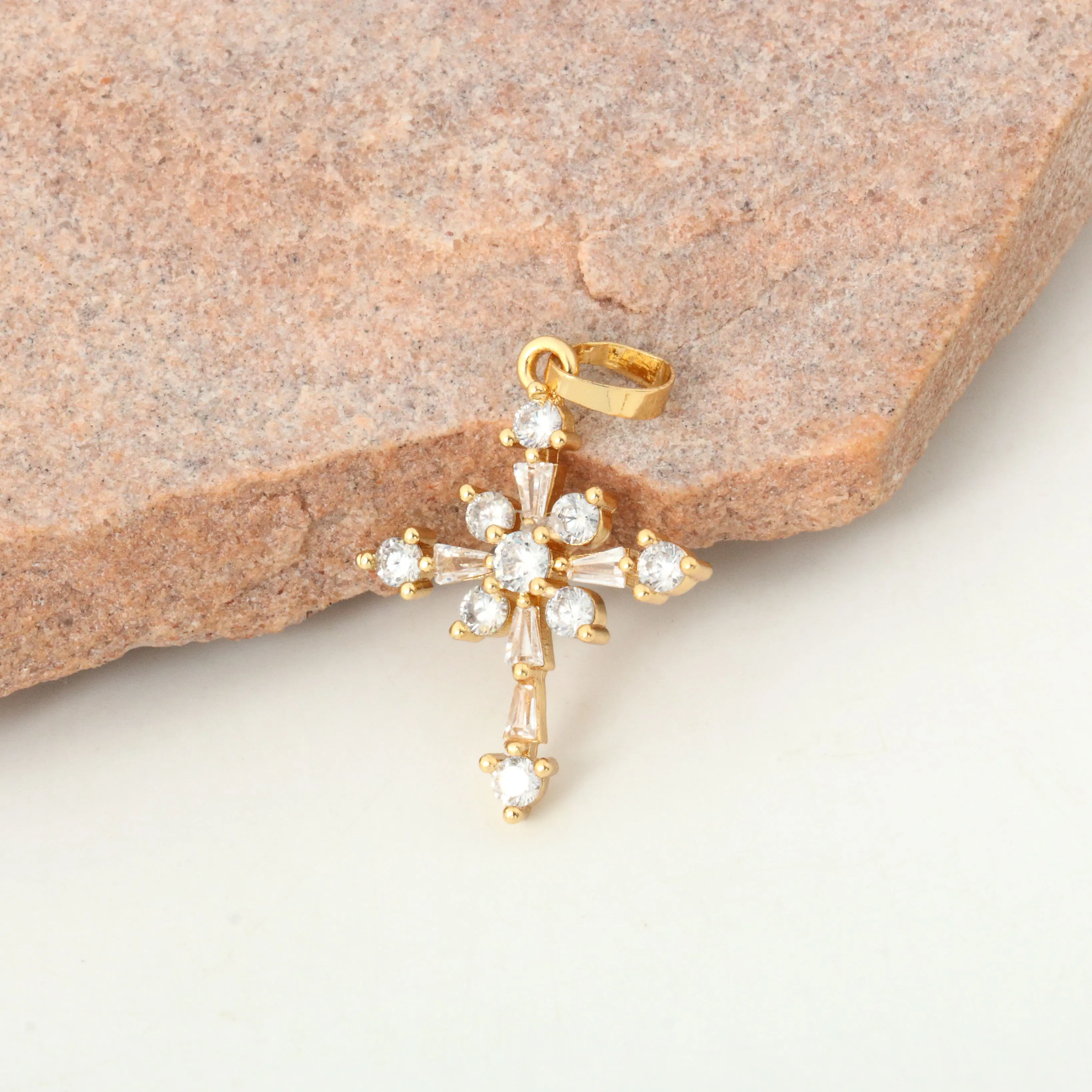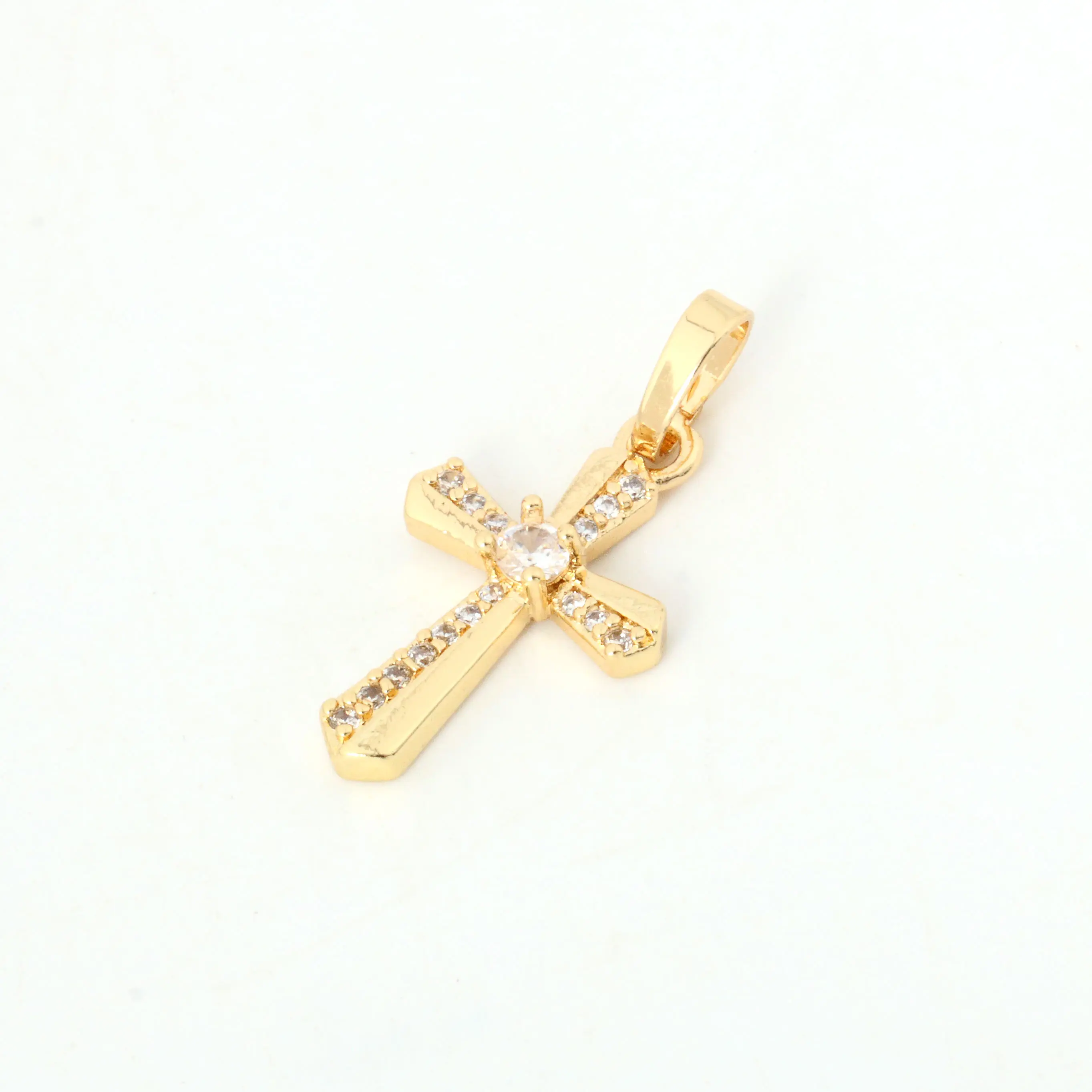 Trendy gold-plated cross charm pendant crafted from durable copper alloy, featuring sparkling zircon stones in a secure bezel setting. Designed for women, this stylish piece is perfect for DIY jewelry or everyday wear, adding a modern touch to any outfit. Every pendant comes with a necklace as a gift!