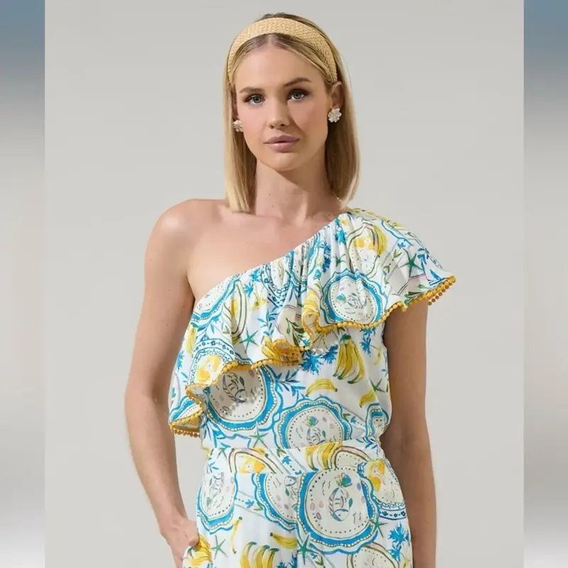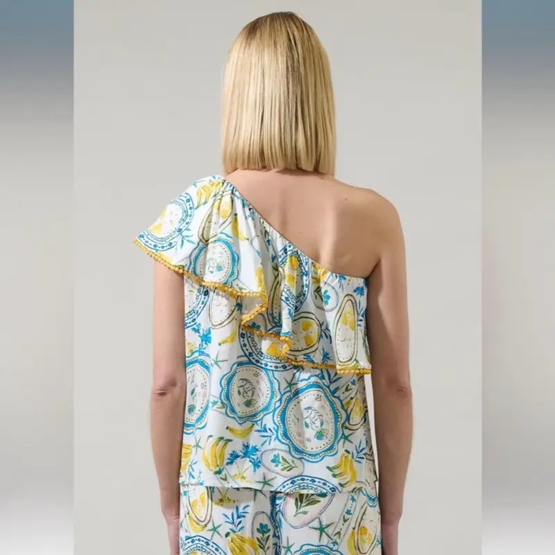 Theres always room in your closet for the Harvest Island Brinley One Shoulder Ruffle Top. A fun print designs this one shoulder top with a stretchy band, ruffles and a yellow border trim. You can style it with its matching pants for a full look.