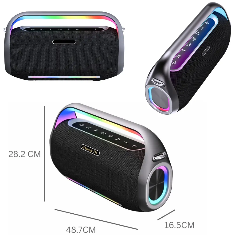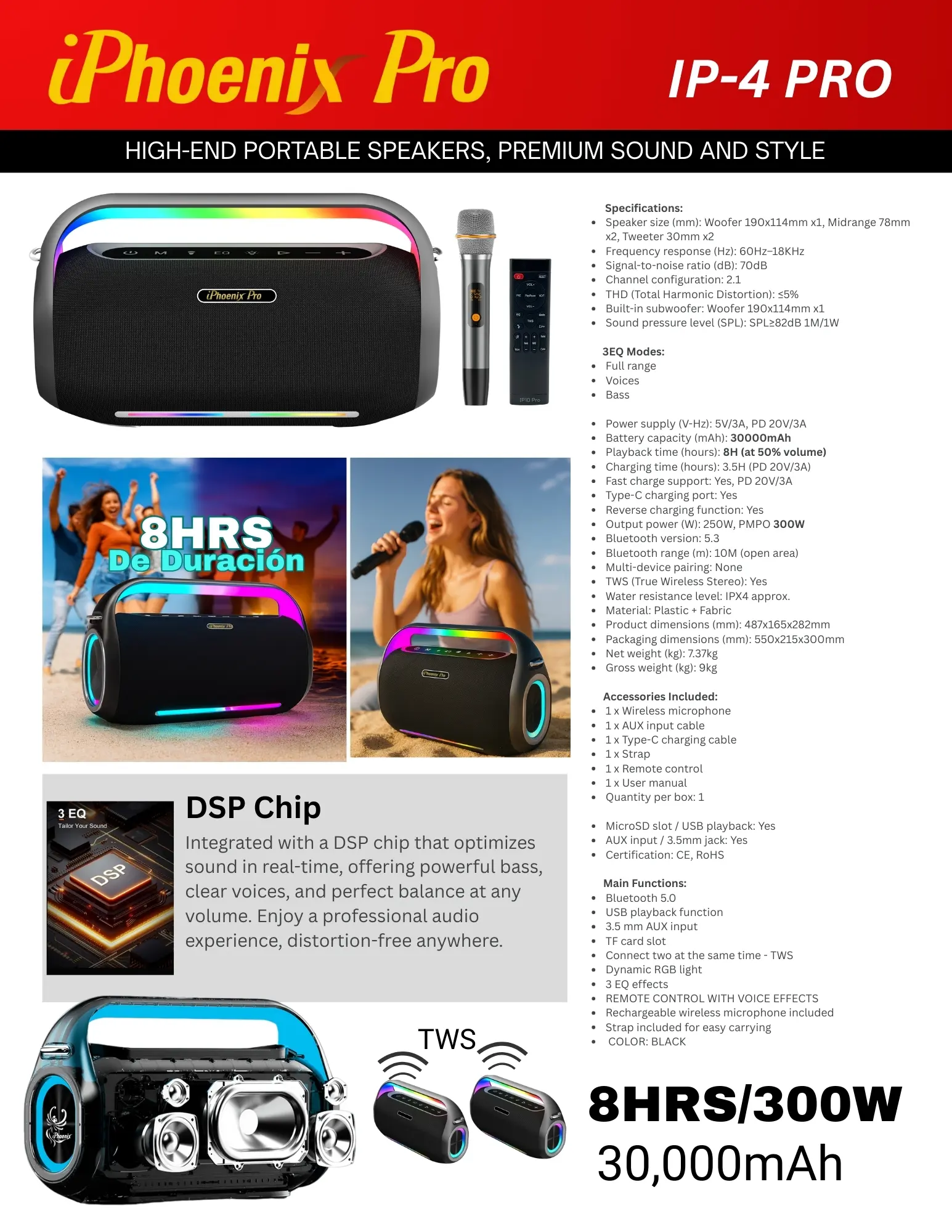 Customize every moment with 3 EQ sound effects, and light up the vibe with dynamic LED lighting that dances to the rhythm. Powered by a massive 30,000mAh battery, the IP4 Pro keeps the party alive for up to 8 hours, and recharges in just 3.5 hours with advanced quick charge technology.