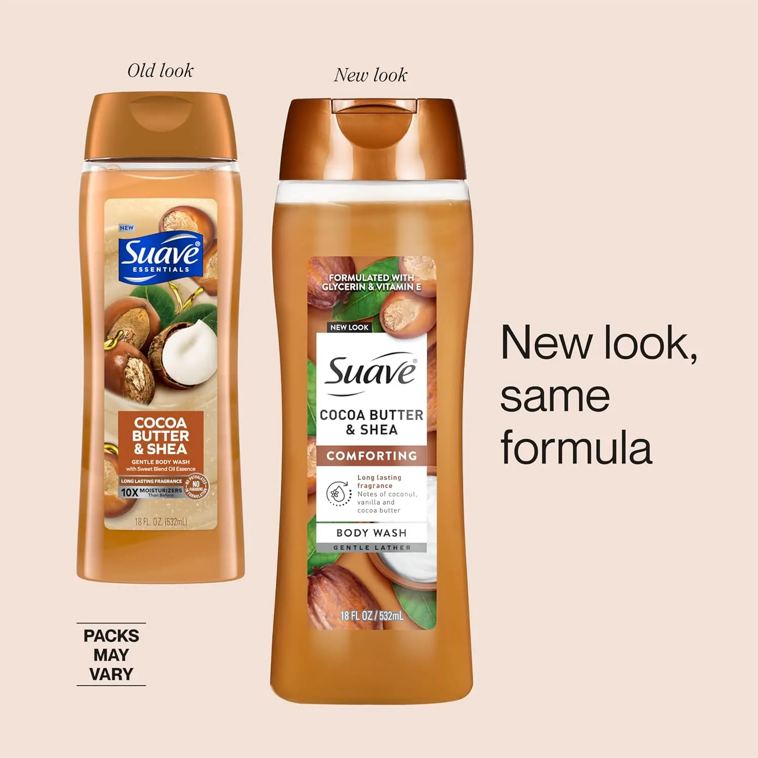 ·Give your skin the love it deserves with Suave Essentials Coconut + Shea Butter Body Wash—a daily indulgence for comforting scent lovers and pampering enthusiasts. Enriched with glycerin and vitamin E, this formula nourishes your skin to keep it soft, smooth, and hydrated. The creamy, foaming lather gently cleanses without stripping natural moisture, leaving your skin soft, smooth, and nourished after every wash. Infused with the decadent aroma of whipped cocoa butter, luscious coconut, and warm vanilla it transforms your shower into a spa-like escape. With its family-size bottle, this moisturizing body wash offers salon-quality skincare at an affordable price— perfect for daily use by the whole family. Treat your skin to hydrating body wash that delivers both deep moisture and irresistible scent—because feeling great in your skin should be an everyday luxury. Like all Suave products, our body washes are cruelty-free and never tested on animals. They are also free of parabens and phthalates. For over 75 years, Suave has offered professional quality haircare and skincare products for the entire family. Suave is committed to quality and accessibility, with a mission to make gold-standard products attainable for everyone, empowering people to look, smell, and feel their best every day.