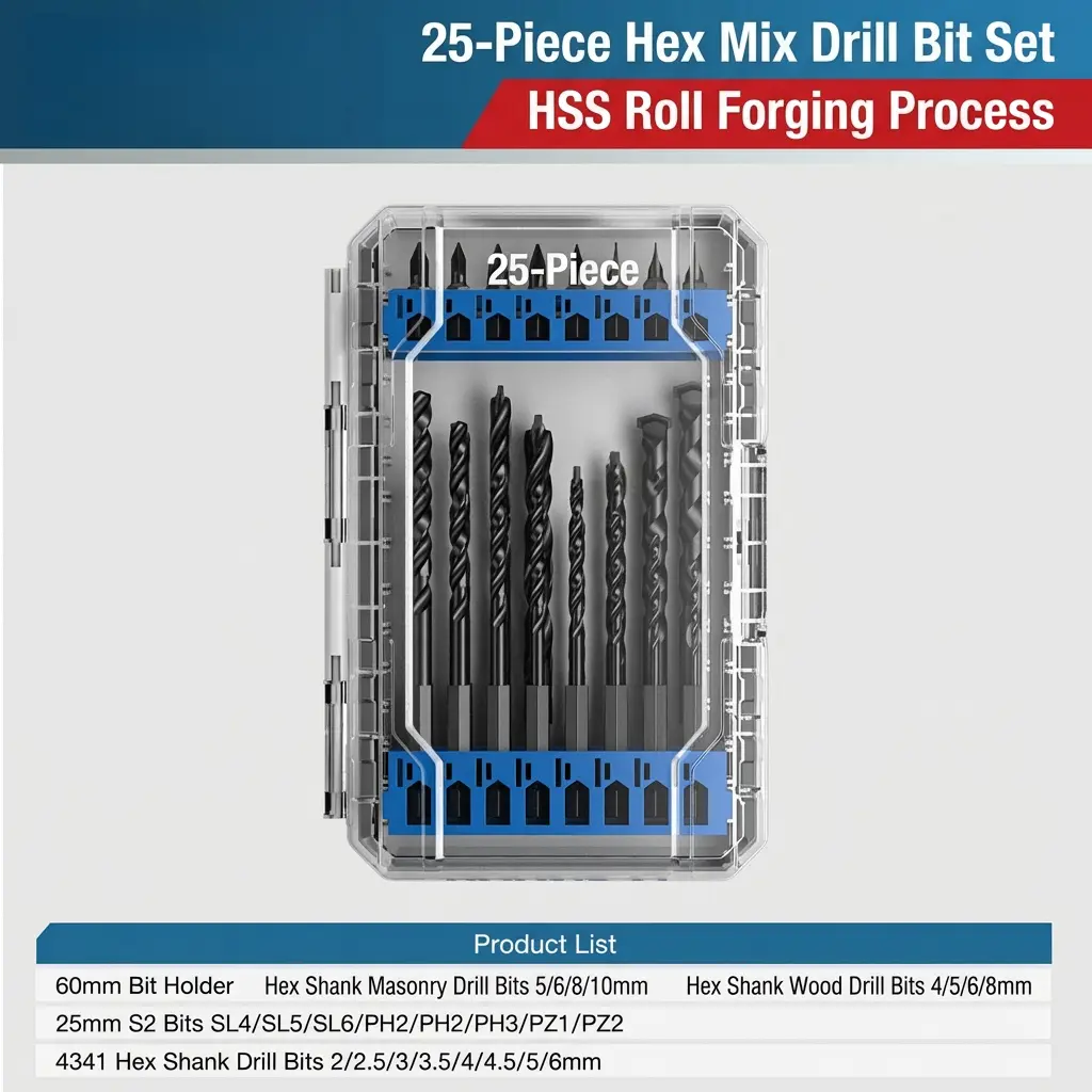 25 PCS Multi-Purpose Drill Bit & Screwdriver Bit Set, S2 Steel Impact Bits + Premium HSS Metal Wood Masonry Drill Bits with Extension Bar, Power Tool Kit for Impact Drill with Storage Case