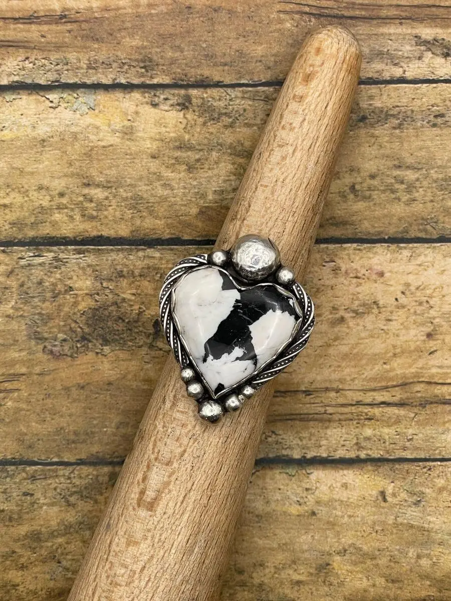 This beautiful one-of-a-kind ring features a heart-shaped White Buffalo turquoise stone with striking natural black and white patterns. Mined in Nevada, White Buffalo is a rare and highly valued stone known for its bold contrast and distinctive character.