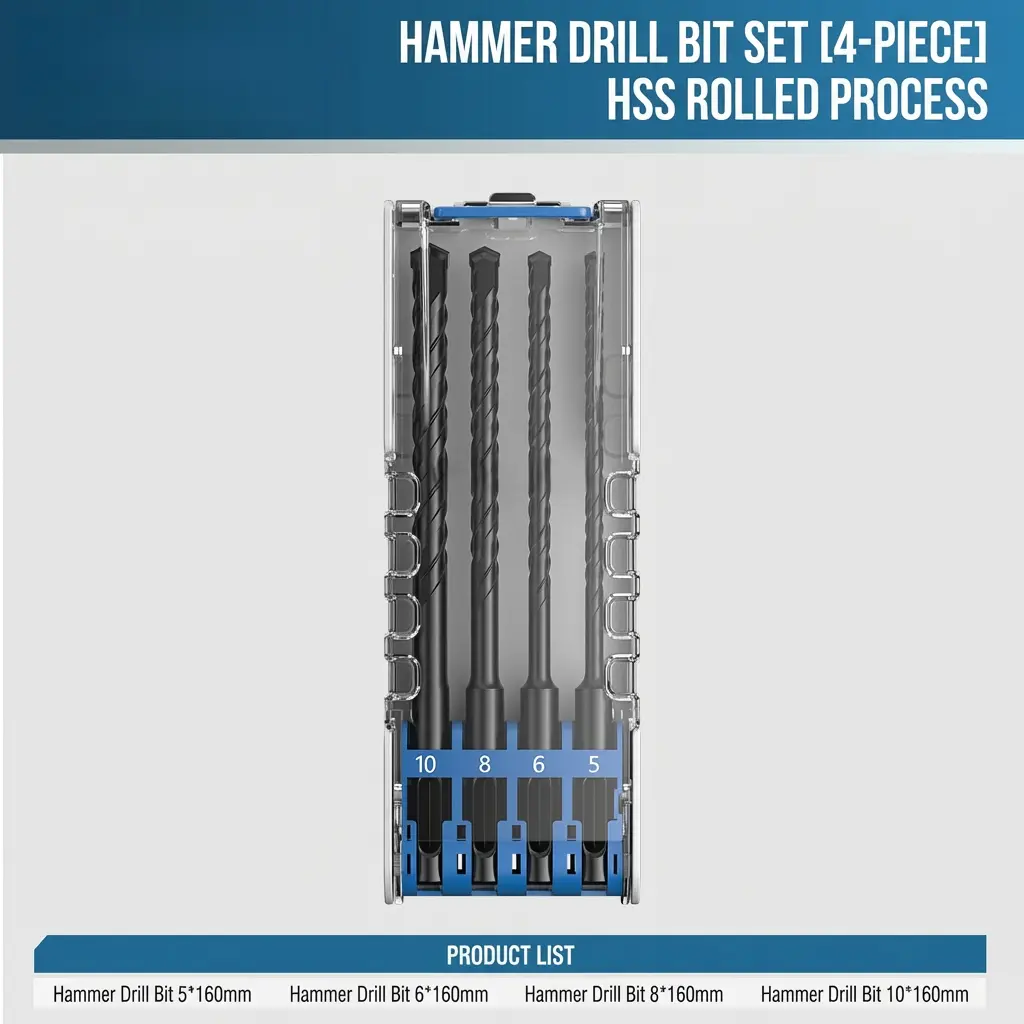 4 PCS Heavy Duty Hammer Drill Bit Set, 160mm Masonry Drill Bits 5/6/8/10mm for Concrete Brick Stone, Impact Resistant Power Tool Accessories for Rotary Hammer Drills with Storage Case