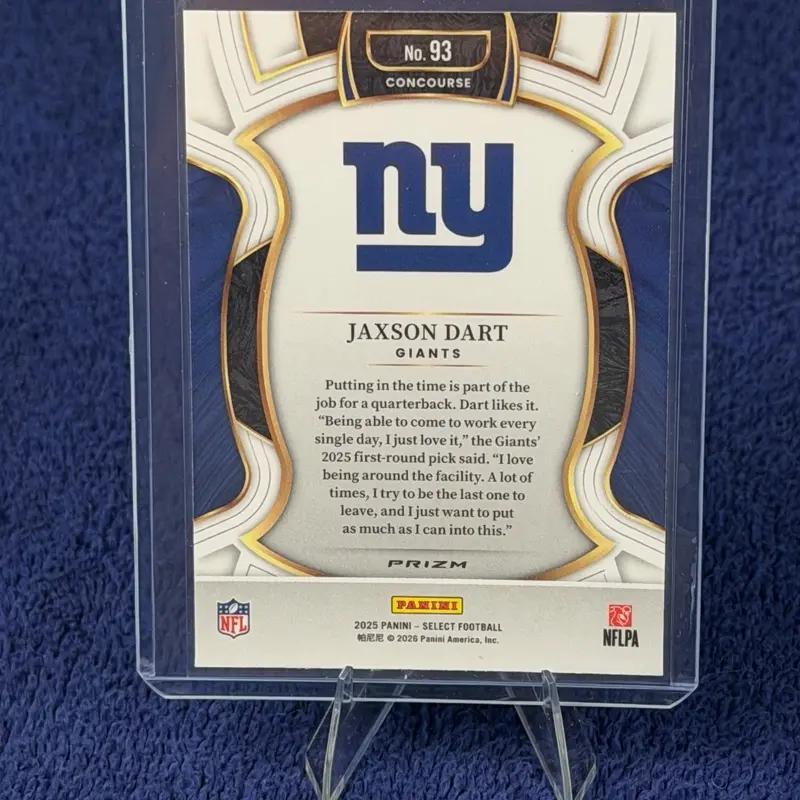 This card features Jaxson Dart, a rookie for the Giants NFL. It is part of the 2025 Panini Select series, showcasing a vibrant Green and Yellow Prizm design. The card is numbered #93, highlighting Dart's rookie status. Perfect for collectors and fans of the Giants NFL team.