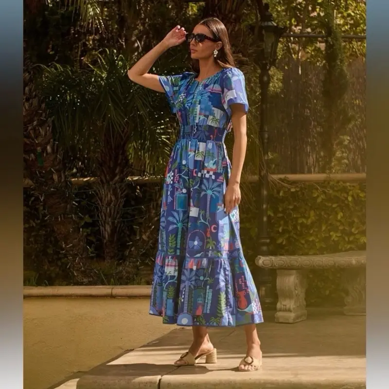 SugarLips Punta Alta Ordy Smocked Midi Dress Cobalt Combo Summer Floral Shortsleeve