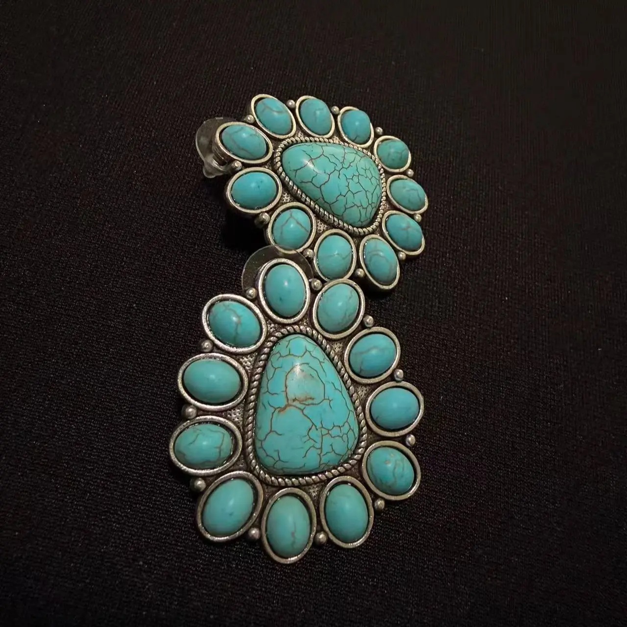 Vintage-inspired statement earrings featuring a bold turquoise-style cluster design with a teardrop centerpiece surrounded by oval stones. Crafted in an antique silver-tone finish with intricate detailing for a classic Southwestern and boho aesthetic. Lightweight with secure push-back closure for comfortable wear. Perfect for adding a striking, rustic touch to western outfits or elevating everyday looks with a statement accessory.
