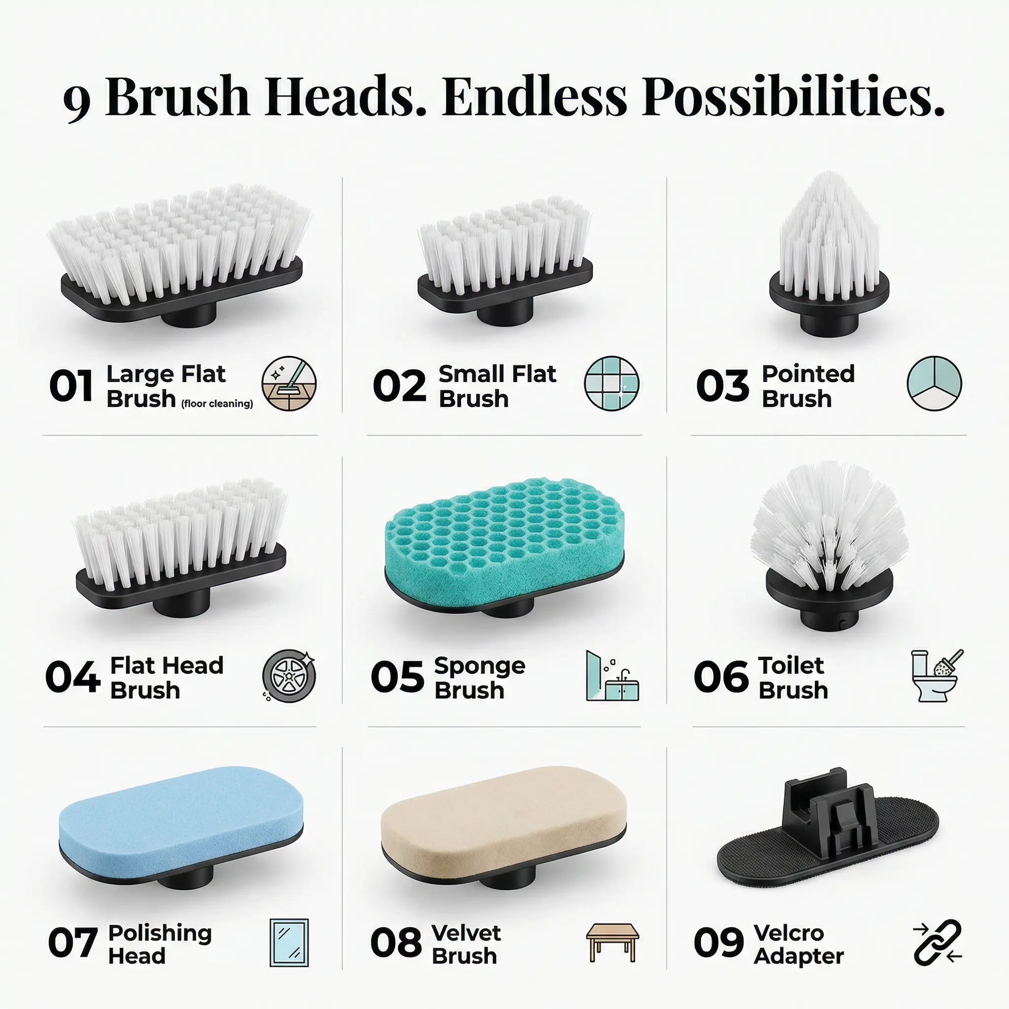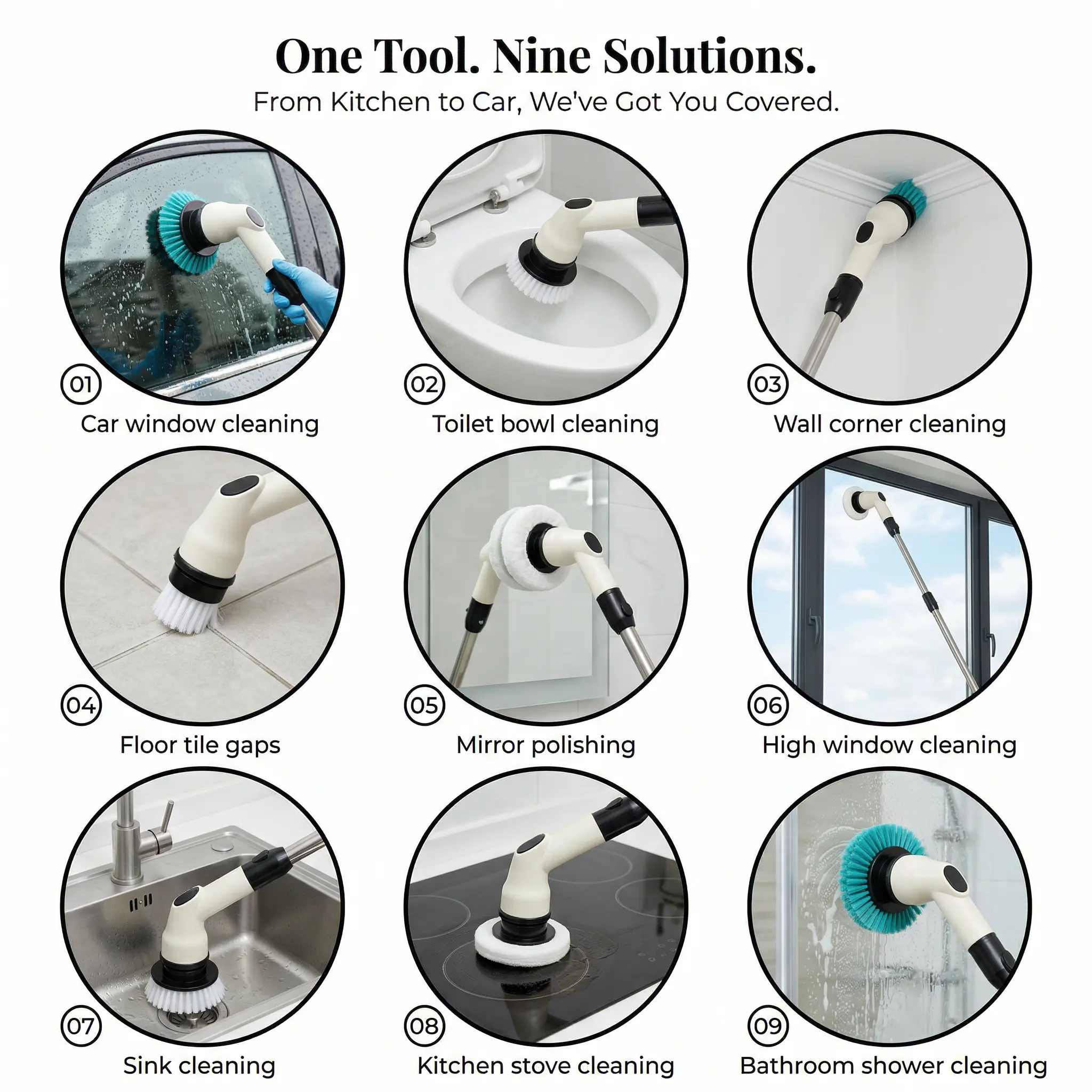 ·[The Only Scrubber You'll Ever Need]: Features a massive9-in-1 tool kit.From wide flat brushes for floors to pointed brushes for grout and sponges for delicate glass.No corner is out of reach.