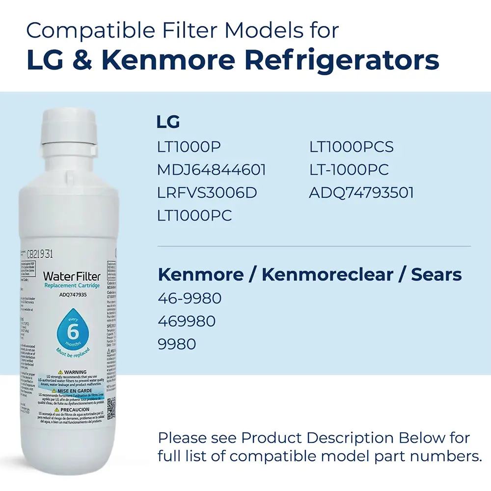 The LT1000PC Replacement is designed for LG LT1000P/PC/PCS models. It fits ADQ747935, ADQ74793501, ADQ74793502, MDJ64844601, LMXS28626S, and LFXS26973S. This part is also compatible with LT-1000PC, LT1000, and Kenmore 9980 Refrigerator Water. Ensure compatibility before purchase.
