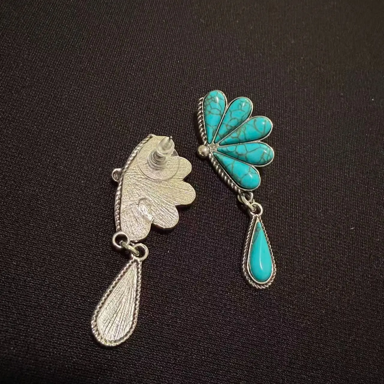 Vintage-style drop earrings featuring a fan-shaped arrangement of turquoise-style stones with natural veining patterns. Accented with antique silver-tone detailing and a dangling teardrop charm for added movement and elegance. Lightweight and eye-catching, these earrings bring a bold Southwestern and boho-inspired look, perfect for both casual outfits and statement styling.