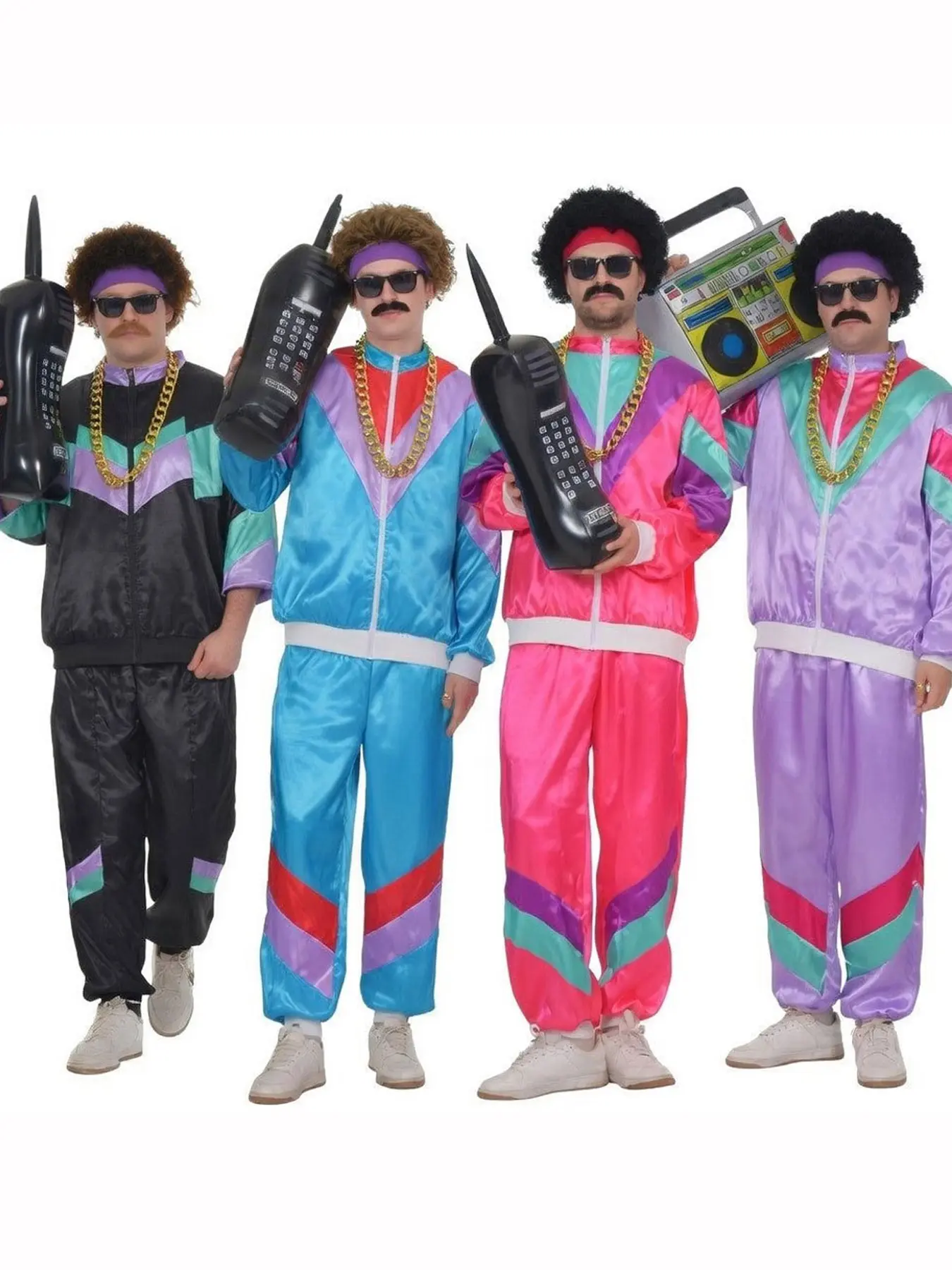 Men's 80s 90s Hip Hop Rapper Costume - Neon Pink Shiny Tracksuit with Inflatable Retro Cell Phone Prop & Gold Chain - Old School 1980s Party Outfit