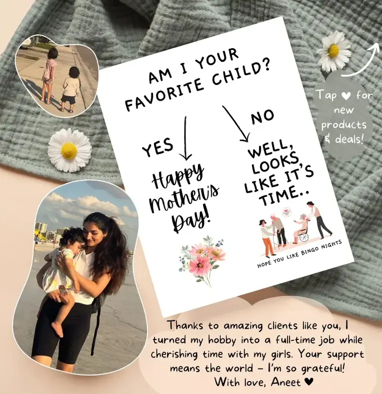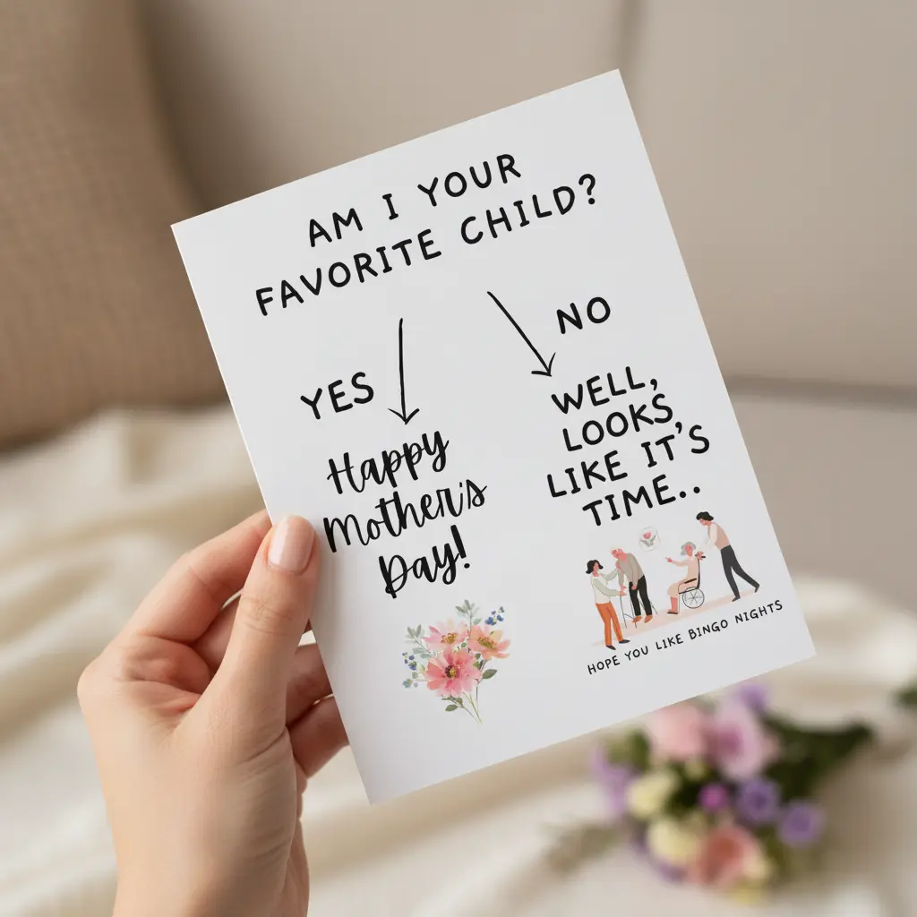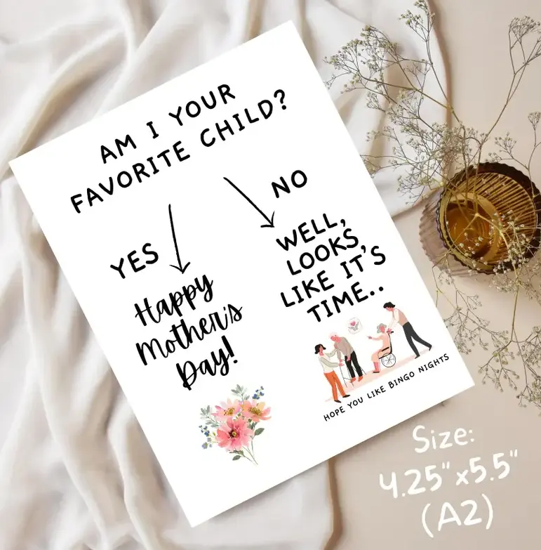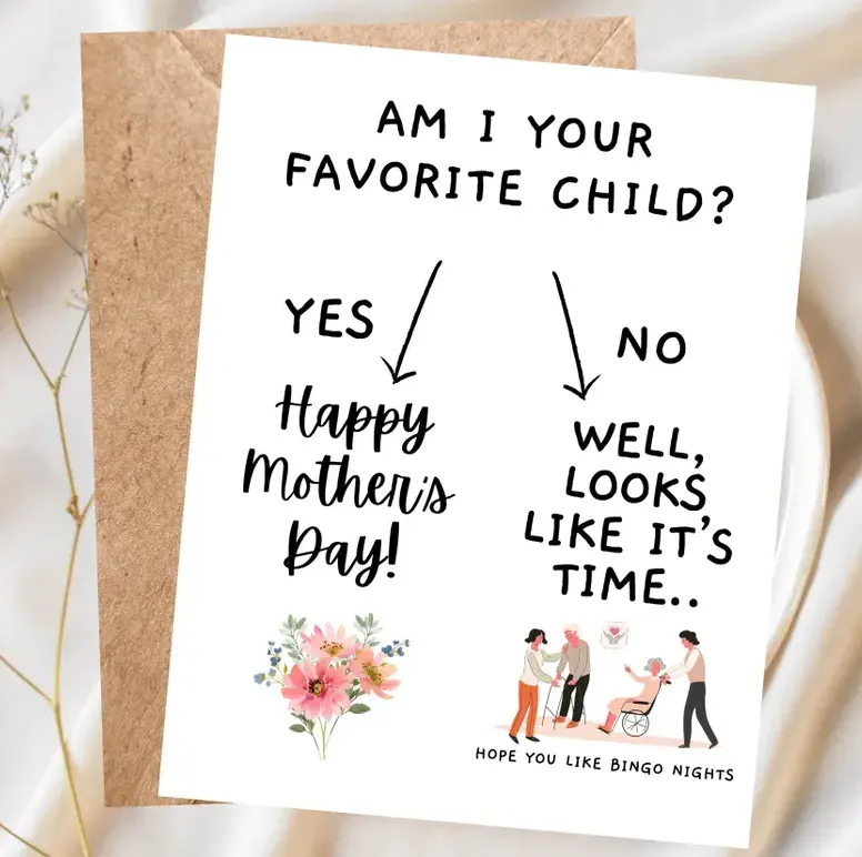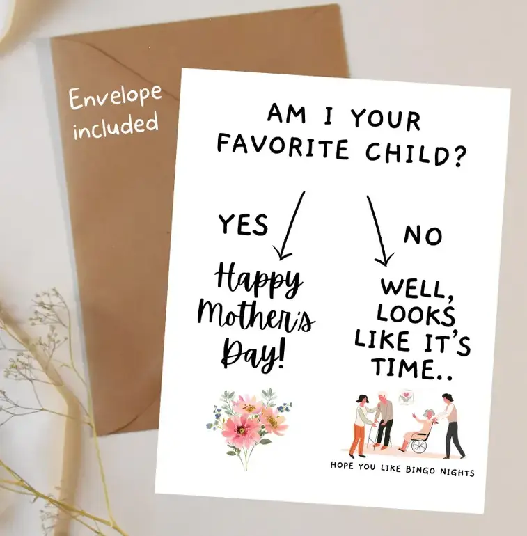 ·Am I Your Favorite Child? This card is a hilarious choice for Mother's Day. It's designed to bring a smile with its playful humor. Ideal for nursing homes, it adds a touch of fun to the day. Perfect for siblings who love a good rivalry card for mom.