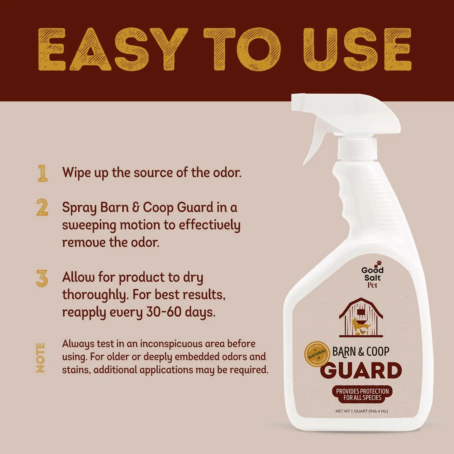 COMPLETE YOUR ROUTINE WITH BARN AND COOP CLEAN – Use Barn and Coop Clean to remove mess and bacteria, then apply Barn and Coop Guard to protect and preserve. Together they create a comprehensive care routine for healthier animal environments.