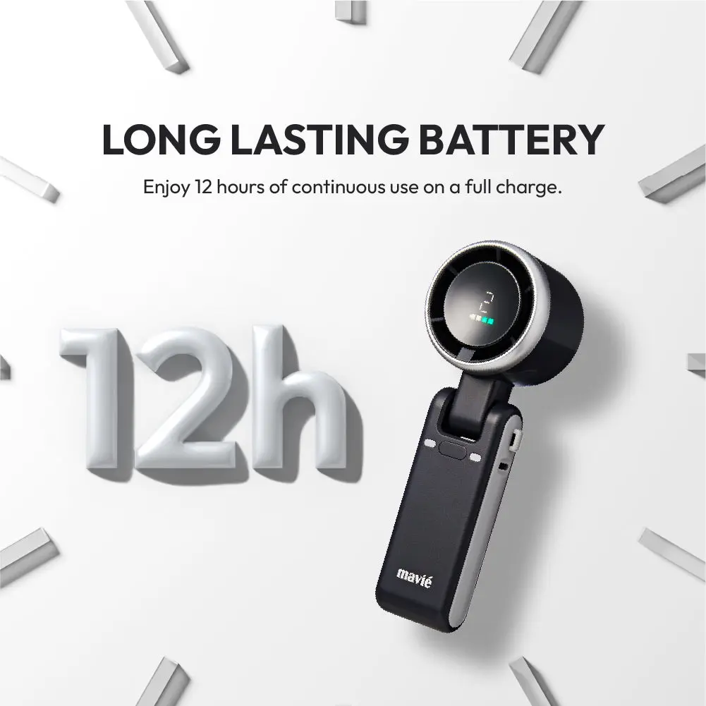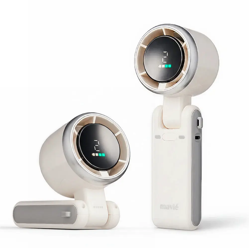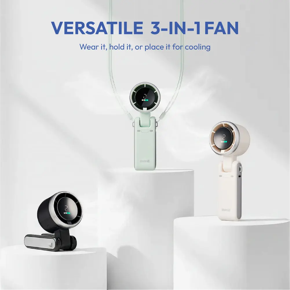 Meet your ultimate summer companion. The MAVIÉ 3-in-1 Portable Turbo Fan is intelligently designed to adapt to your needs, effortlessly converting from a handheld fan to a hands-free neck fan or a convenient desktop fan. Equipped with a high-capacity 3600mAh battery for up to 12 hours of continuous use, this compact powerhouse ensures you stay refreshed all day. With an intuitive digital display and 5 customizable speed settings, it delivers powerful personal cooling wherever you go—perfect for travel, outdoor adventures, or drying your makeup.