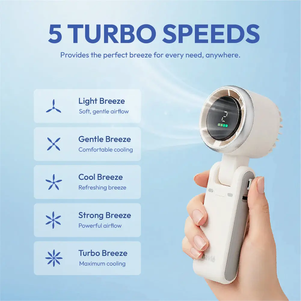 ·Customize your breeze: Choose from 5 turbo speeds—Light Breeze, Gentle Breeze, Cool Breeze, Strong Breeze, and Turbo Breeze—to find your perfect cooling comfort.