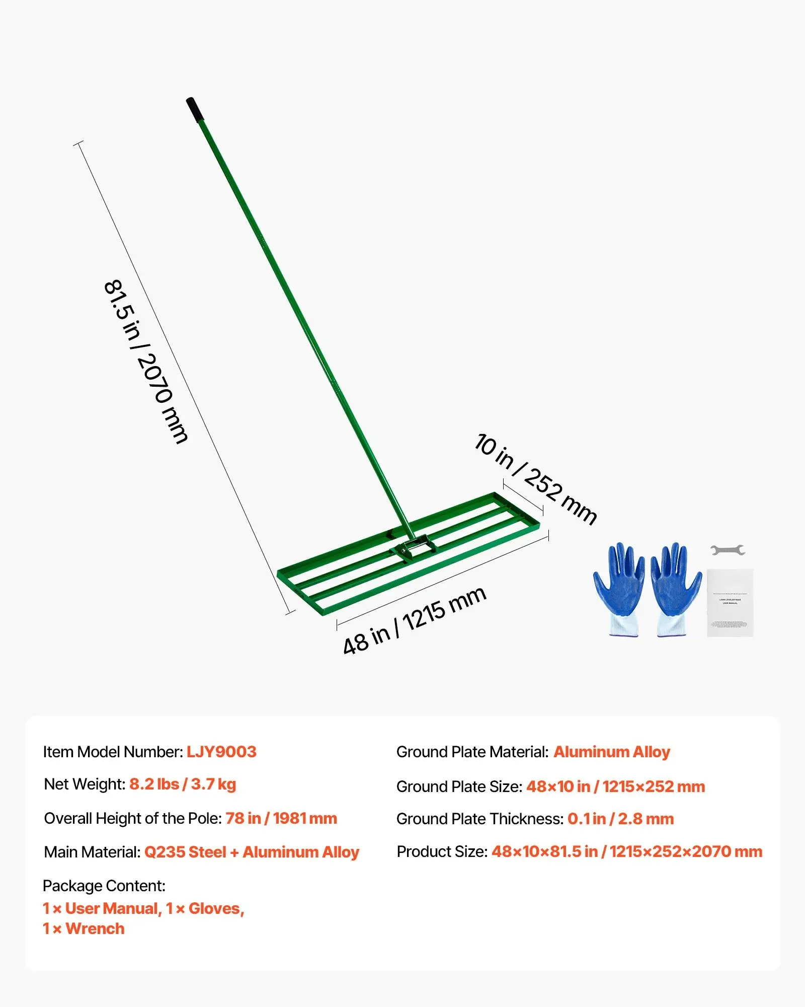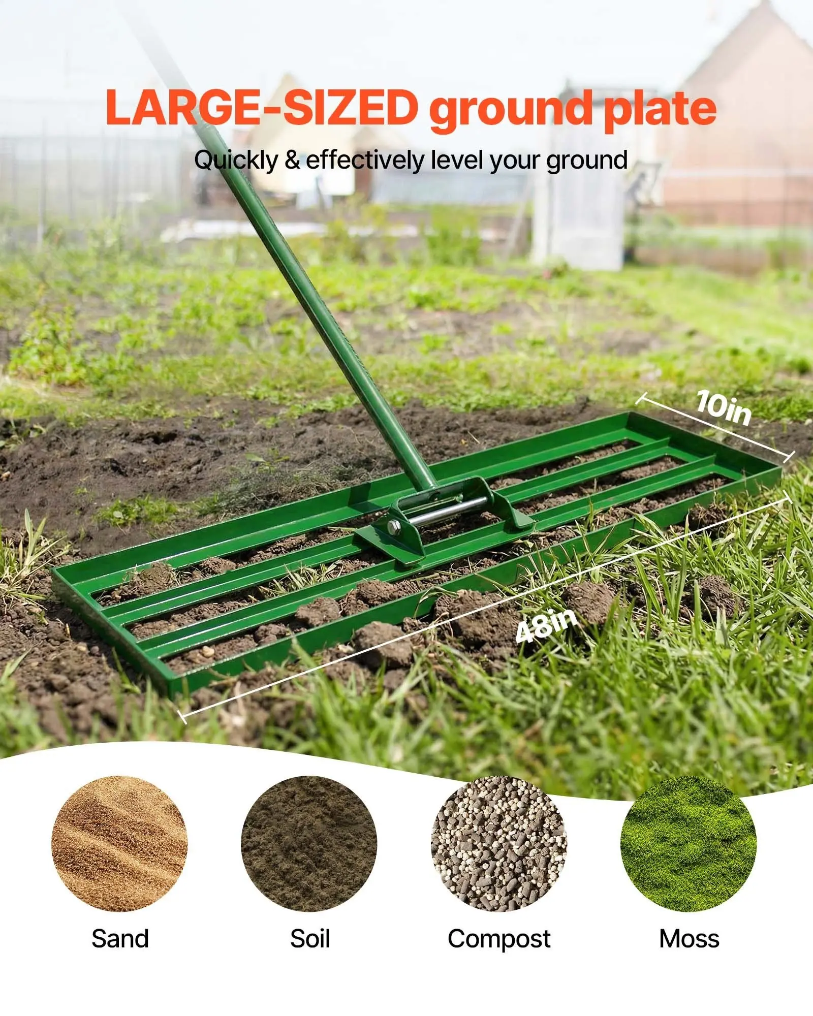 ·Large-Sized Lawn Leveling Rake: 's level lawn tool with a 48x10 inch ground plate, swiftly and effectively levels the ground, saving time and effort. Suitable for various terrains like lawns, farms, gardens, and golf courses for leveling sand, soil, compost, and moss.