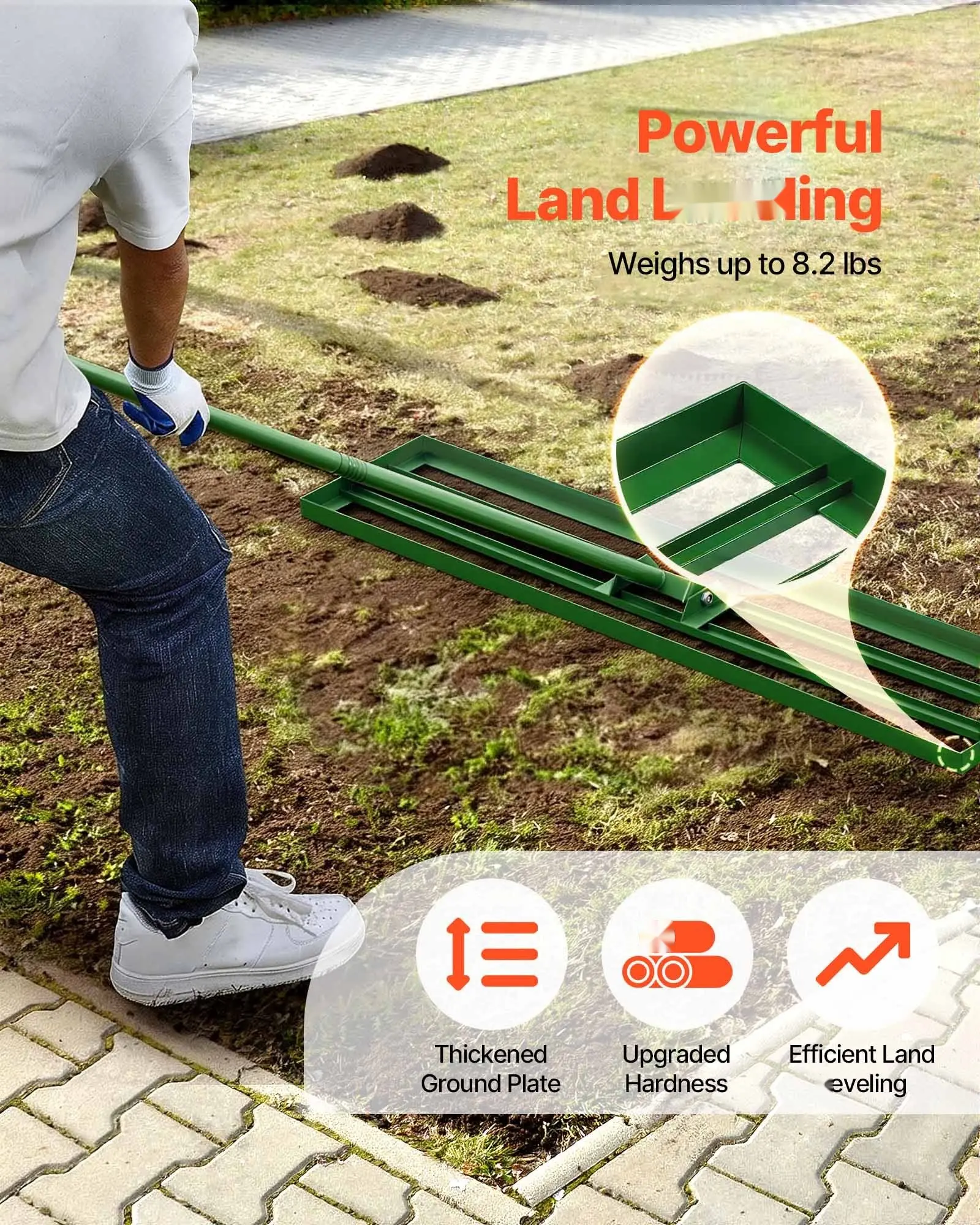 ·Reinforced Welding Craftsmanship: Utilizing full welding between the ground plate and the handle instead of spot welding, ensuring the lawn leveler can withstand heavier work. No concerns about handle breakage, loose connections, or detachment, as it's incredibly robust and durable.