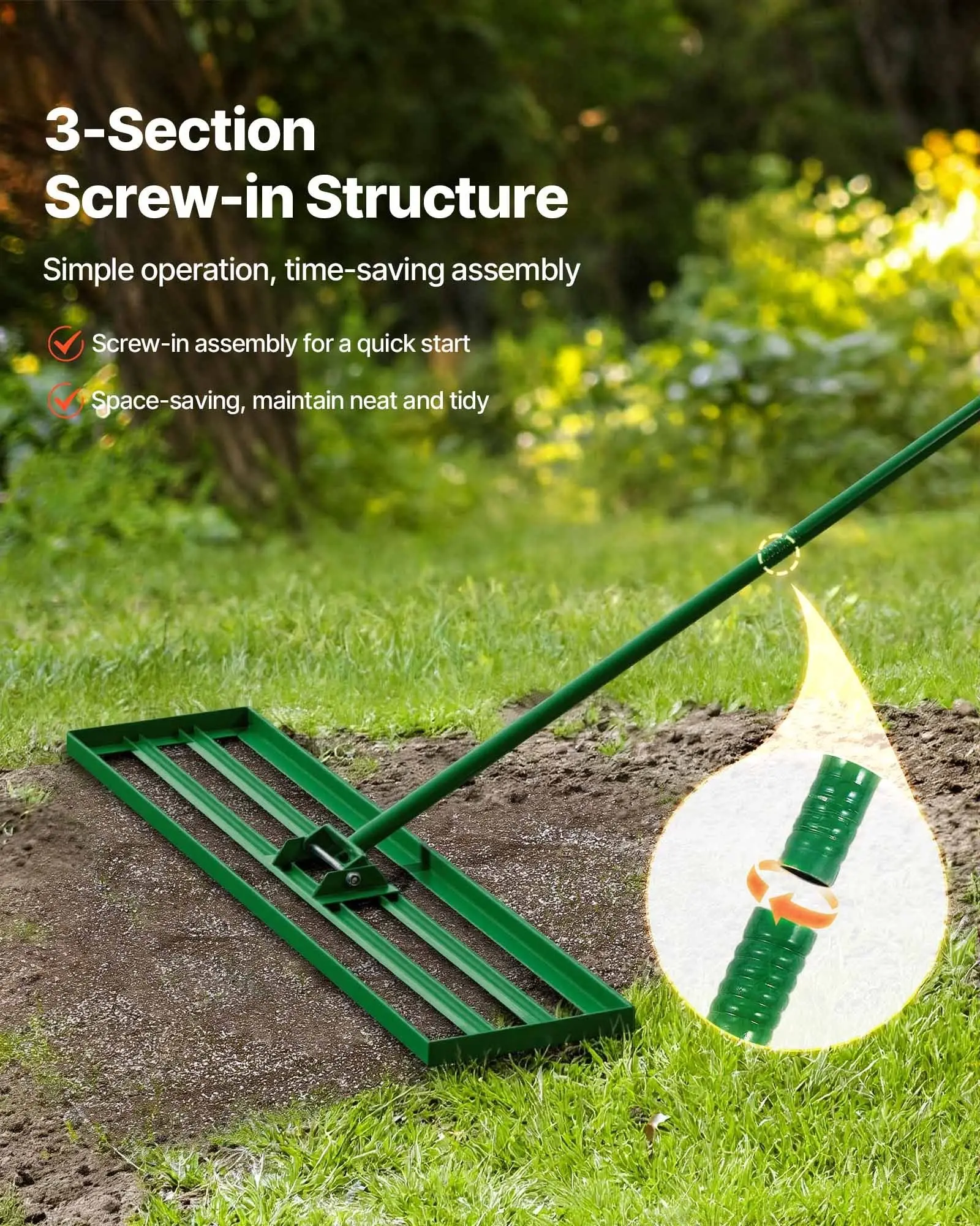 ·Easy Installation & Storage: Featuring a 3-section screw-in design for simple assembly and disassembly. Align the threads of the handle, screw in, and tighten. After disassembly, our yard leveling rake becomes compact for storage. A sturdy screw-in structure ensures durability for lasting use.