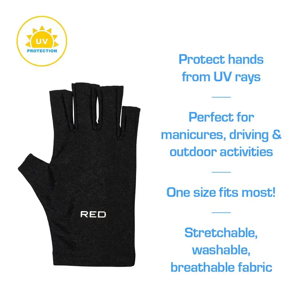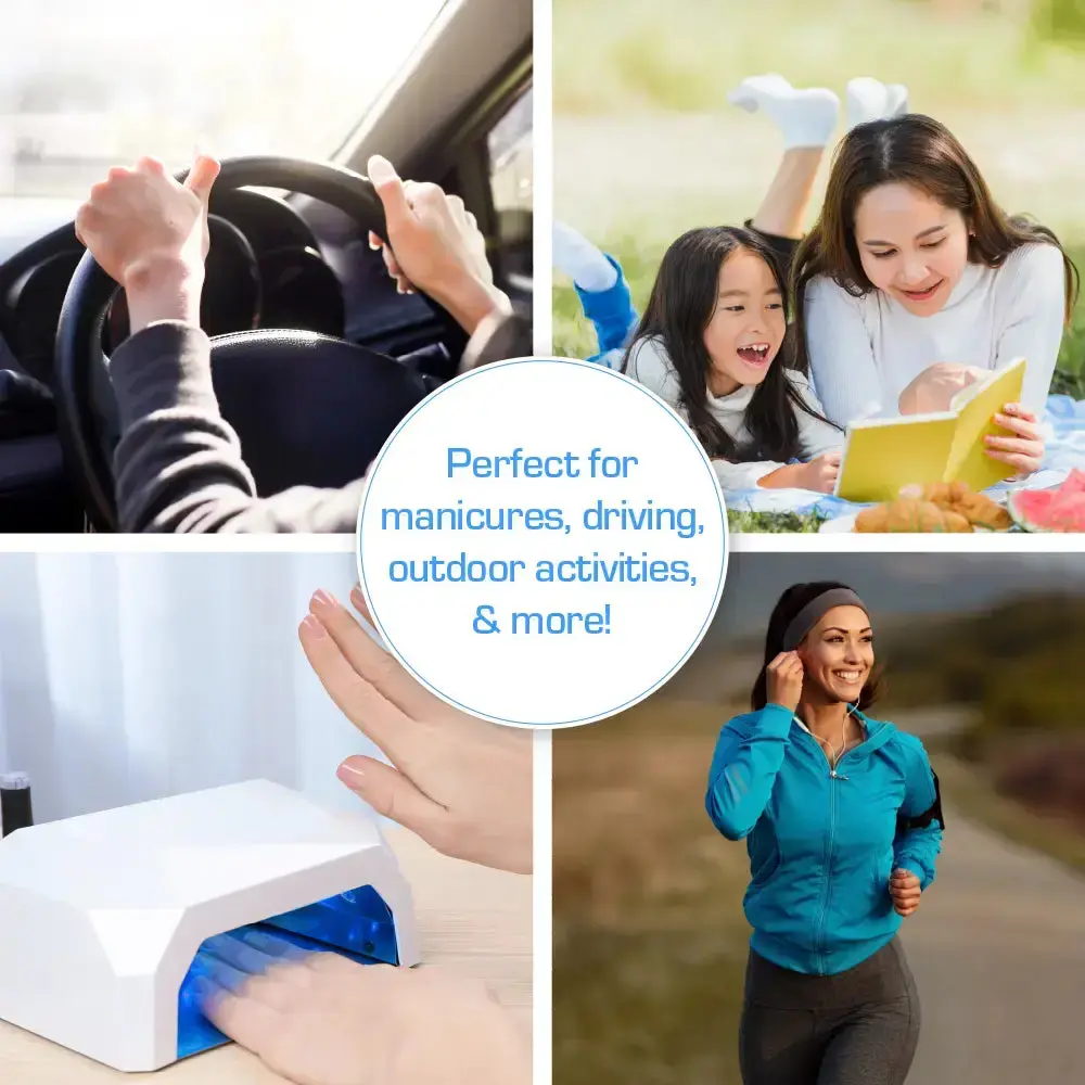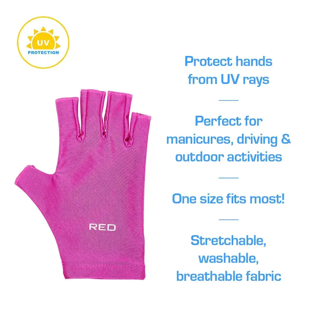 UPF 50+ sun protection: Blocks over 98% of harmful UV rays to protect your hands during outdoor activities like driving, gardening, or walking.Anti-aging benefits: Helps prevent fine lines, dark spots, dry skin, and sun-related pigmentation for healthier, younger-looking hands.Protects during gel curing: Ideal for use under UV/LED nail lamps to prevent sun damage during gel manicures, preserving your skin’s youthfulness.Breathable and stretchable fit: Lightweight fabric ensures a cool, snug fit for all hand sizes without discomfort, sweat, or irritation.Washable and reusable design: Durable material allows repeated use and easy cleaning, offering a sustainable alternative to sunscreen or disposable covers.