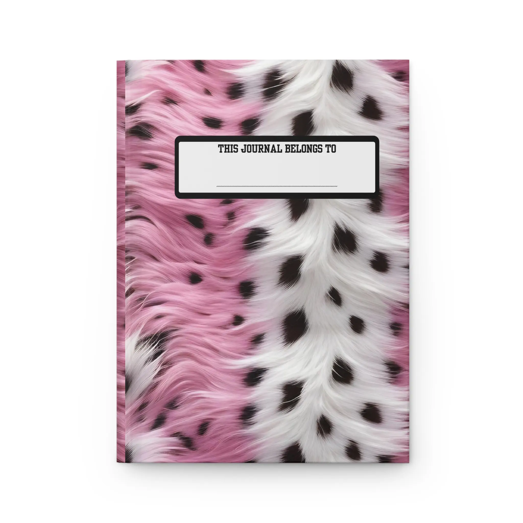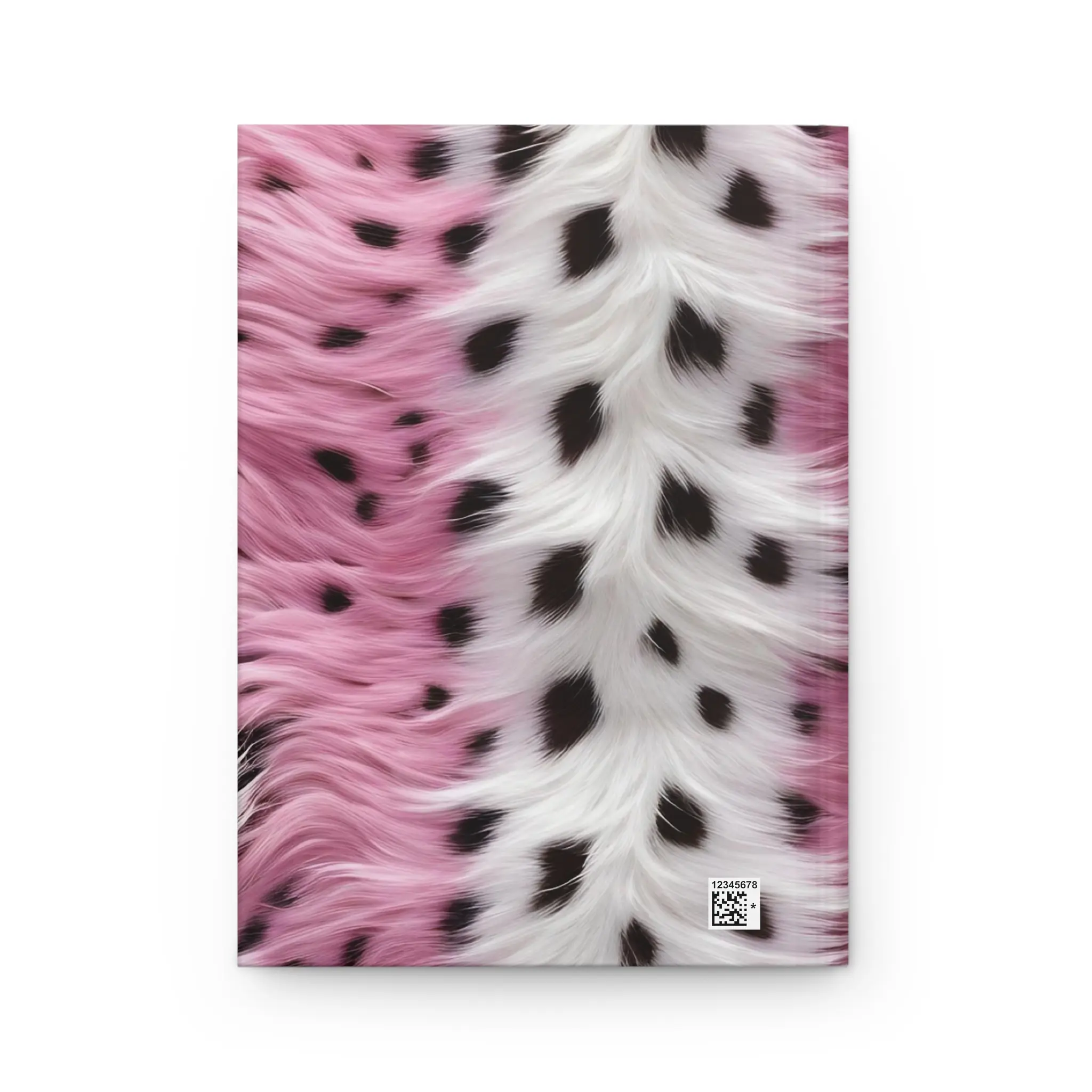 This hardcover journal wraps bold, playful texture in a smooth matte finish — like a little piece of tactile luxury for everyday notes. The cover art mimics soft, fur-like waves in pink and white with scattered black spots, giving the book a cozy, whimsical personality. Inside, 150 lined pages (75 perforated sheets) sit on a flexible sewn spine so the journal opens flat and travels easily in a bag. Full-wrap printing keeps the design continuous around the cover, while the durable matte laminate protects colors and resists scuffs. A small production barcode appears on the back cover.