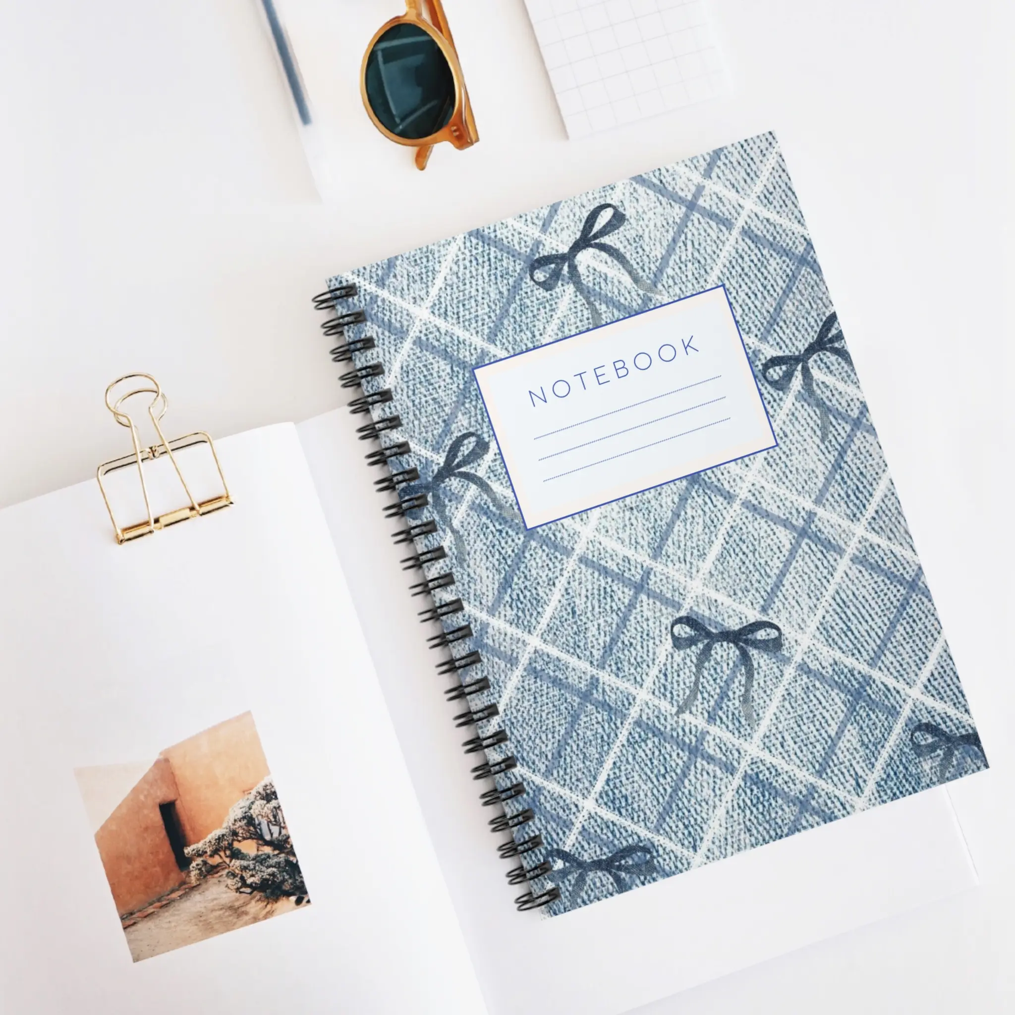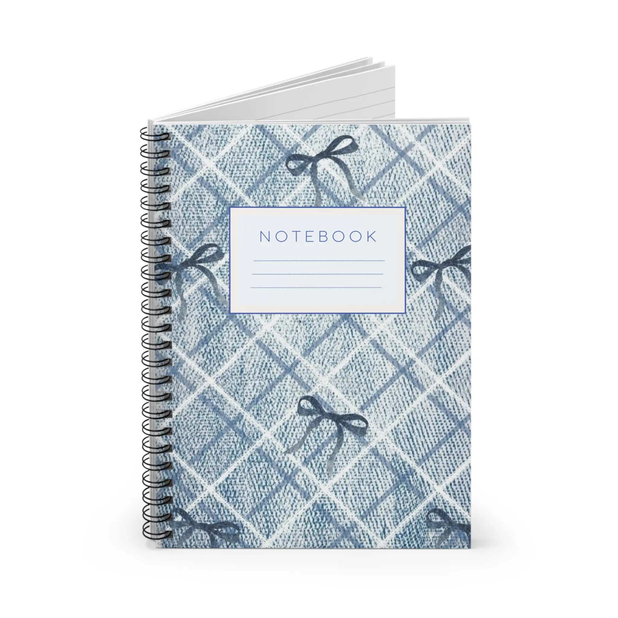 A cozy, hand-drawn ruled notebook with a soft denim-checked cover and delicate ribbon sketches. The 6" x 8" spiral notebook tucks easily into bags and backpacks, inviting quick sketches, lists, or daily journaling. Inside, smooth 90 gsm lined pages make handwriting flow, while a back inner pocket keeps loose notes and receipts safe. The metal spiral lets pages lie flat or be removed cleanly, and the sturdy 350 gsm covers protect your thoughts on the go. This notebook feels familiar and calm — a quiet companion for planning, studying, or keeping small rituals of creativity alive.