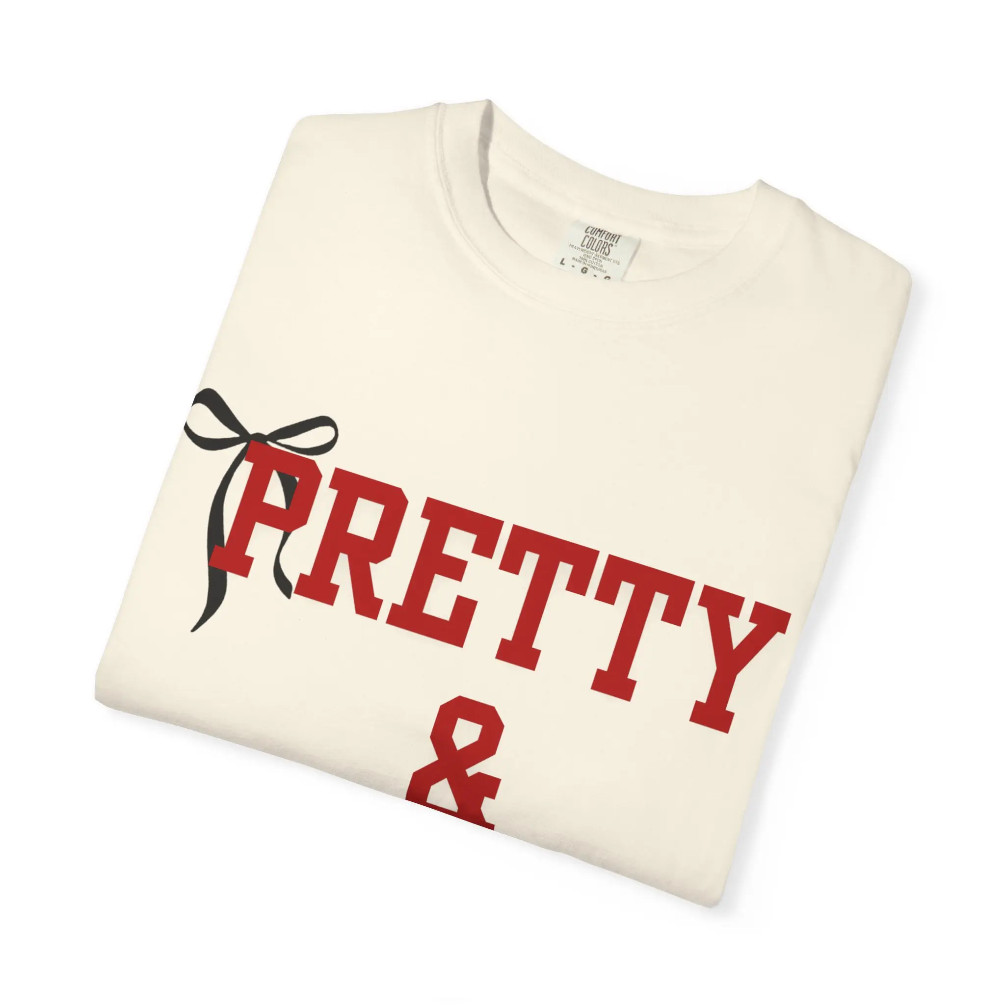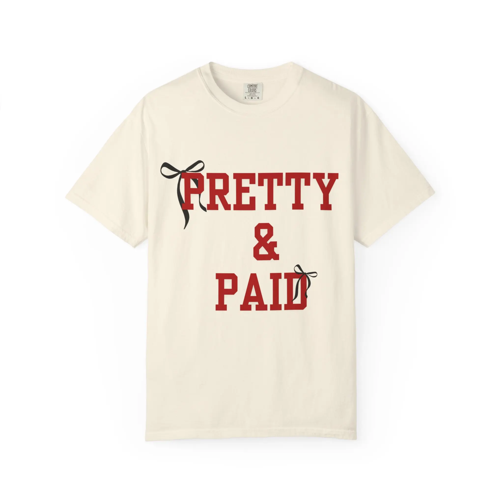 This relaxed, garment-dyed tee carries a bold, confident message with a soft, lived-in feel. The vintage varsity lettering reads “PRETTY & PAID” with subtle ribbon accents — a playful mix of feminine detail and unapologetic hustle. Wear it with high-waisted jeans, a blazer, or layered under an open flannel to lean into casual confidence. The fabric settles comfortably against the skin, the color has that slightly faded, broken-in look, and the stitched finishes mean it holds up after dozens of wears. It’s the kind of shirt you reach for when you want your vibe to say you work hard and enjoy the rewards, but you don’t take yourself too seriously.