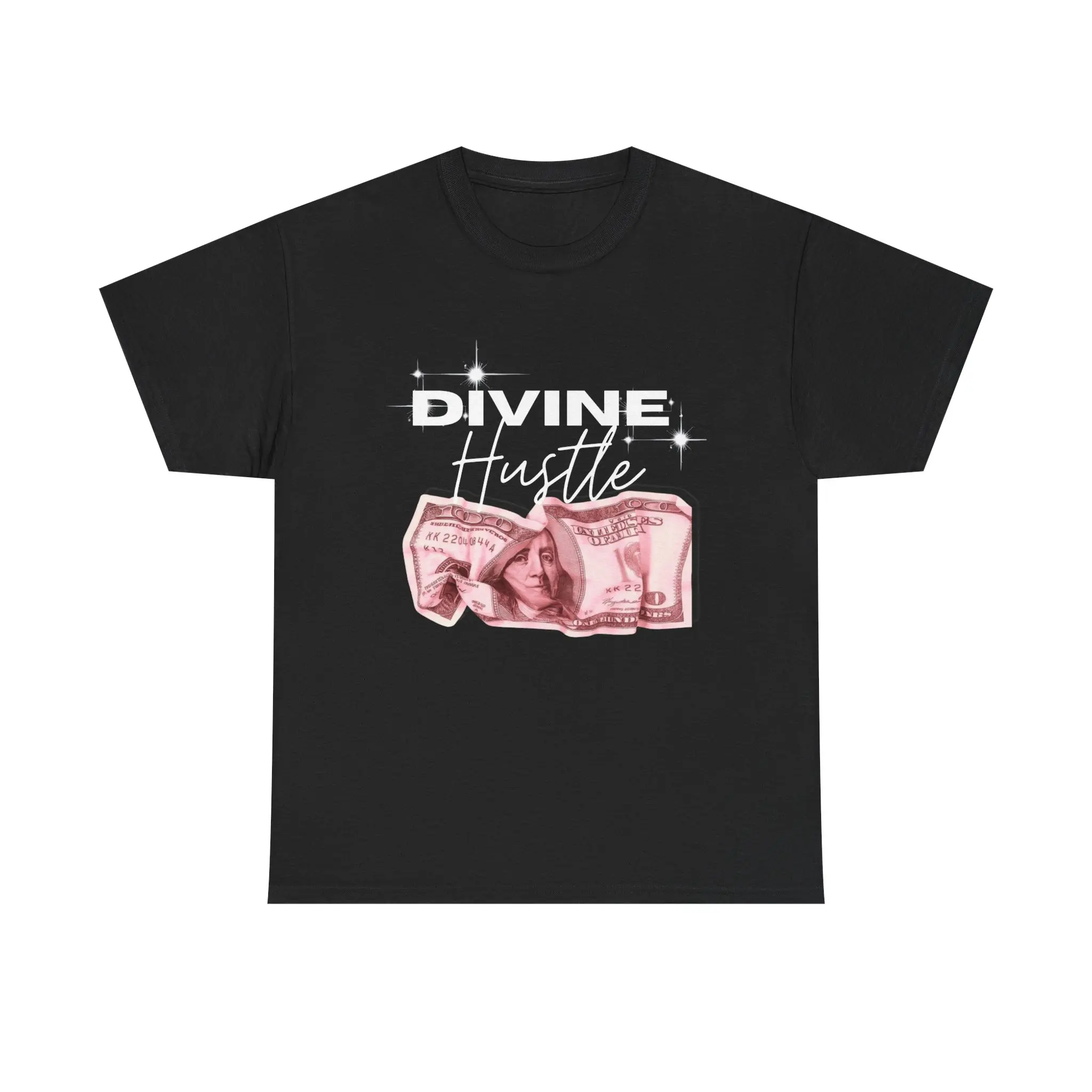 Bold, unapologetic and a little bit playful — this tee carries a message for people who mix ambition with intuition. The black classic-fit shirt features a striking front print: the words “DIVINE Hustle” in mixed bold and script lettering, punctuated by a crumpled pink bill motif and subtle sparkle accents. Wear it to announce a mindset: guided ambition, stylish grit, and a wink of glamour. It layers easily under jackets or stands out on its own with high-waist jeans and statement jewelry. Comfortable enough for long days, it keeps its shape and print clarity through regular wear so the message stays sharp.