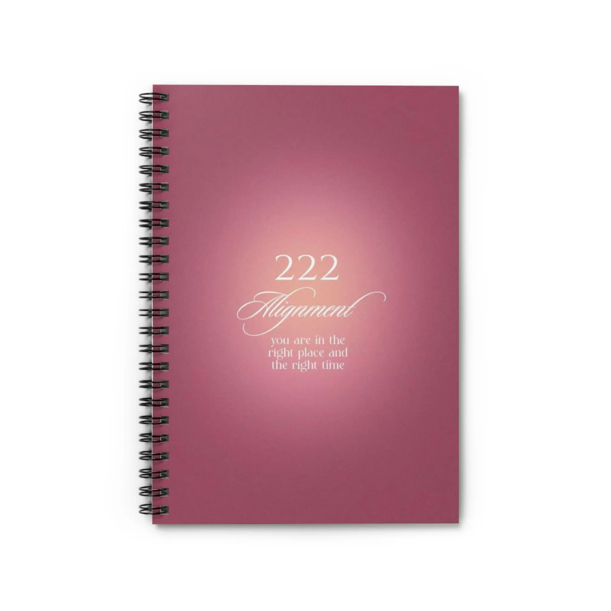 A soft, compact ruled notebook designed for daily reflections and organized notes. The warm rose cover features a subtle glowing motif and elegant script that reads “222 Alignment,” creating a calm, focused mood every time you open it. Inside are 118 lined pages on smooth 90gsm paper that take pen and pencil well. A metal spiral lets pages lie flat and makes it easy to flip or remove sheets. The inside back cover hides a slim document pocket for receipts, loose notes, or inspiring clippings. Sized at 6" x 8", it slips into bags and totes for journaling on the go or keeping at your desk as a dedicated place for plans and intentions.
