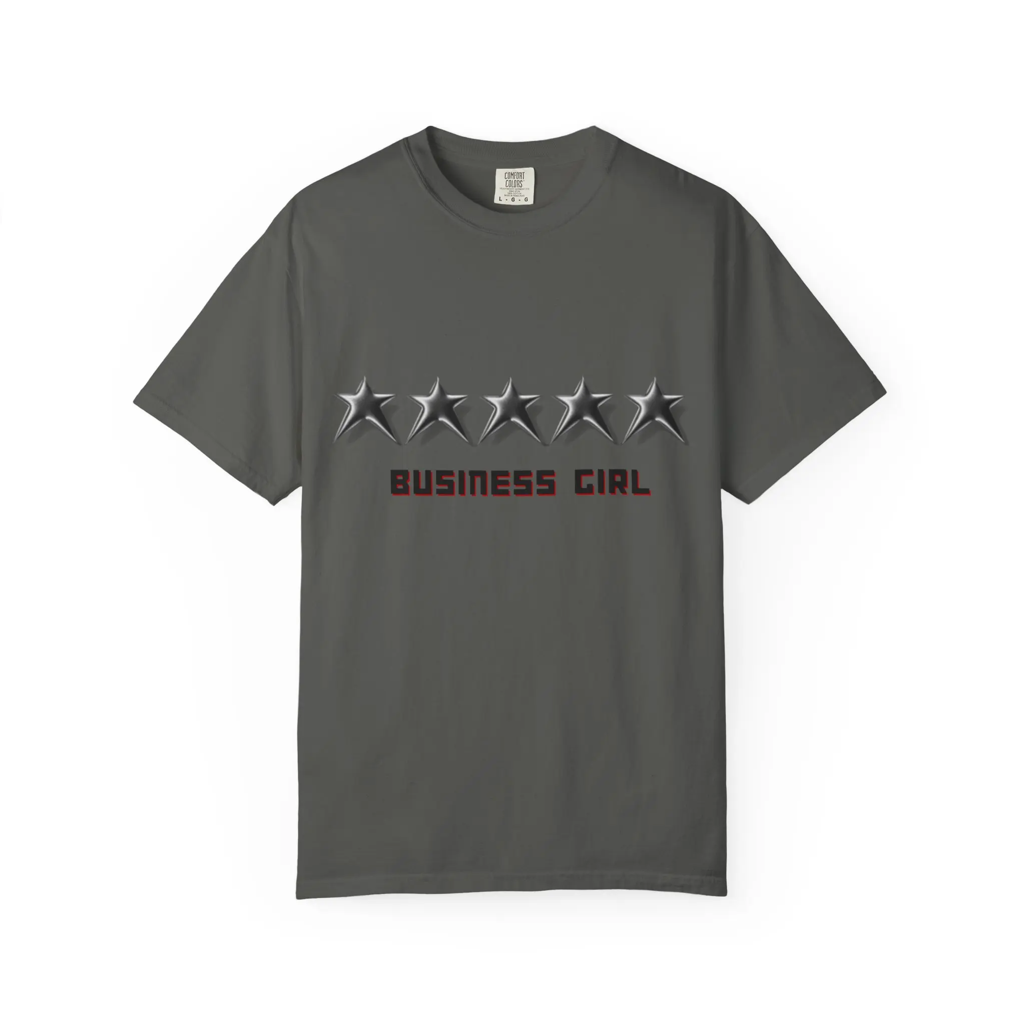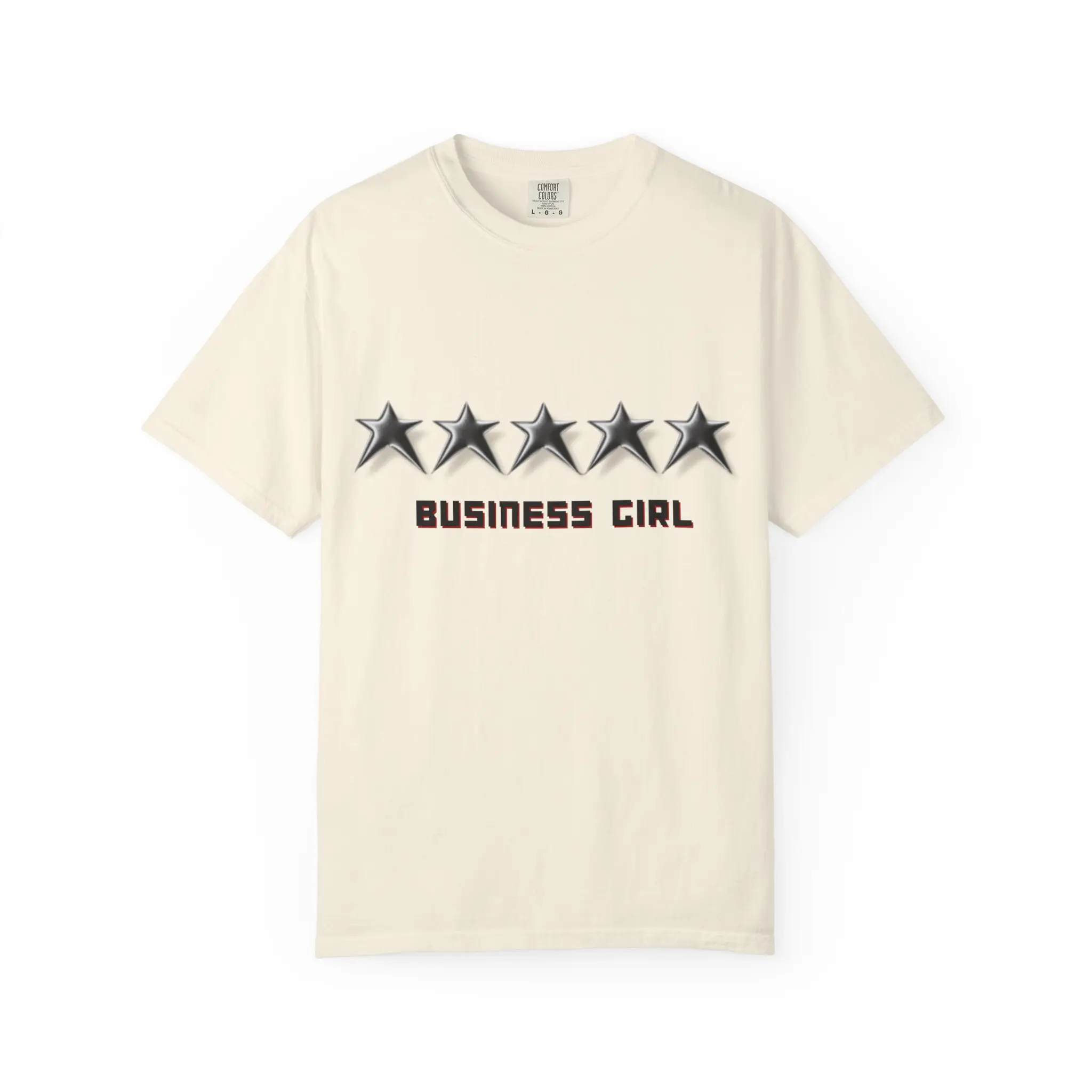 This relaxed garment-dyed tee carries a quiet, confident energy — a soft, lived-in cotton shirt stamped with five metallic stars above the bold “BUSINESS GIRL” text. The muted garment-dye finish gives the white tee a subtle, vintage feel and a softened hand that grows more comfortable with each wear. Wear it to meetings when you want a low-key power move, to coffee dates when you’re sketching plans, or on travel days when ease and style have to coexist. The clean front graphic reads like a personal mantra: steady, professional, and unapologetically ambitious.
