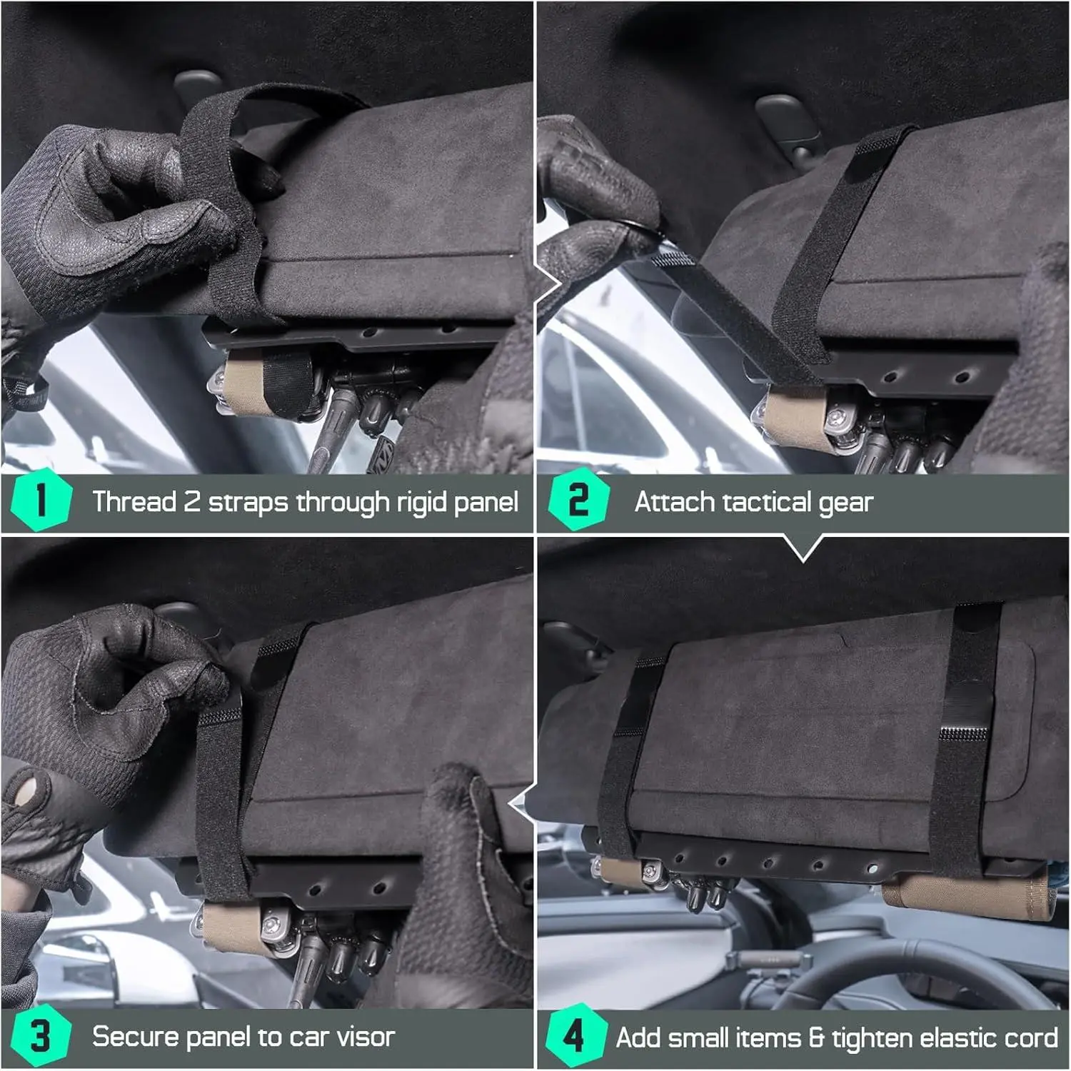 3.Install rigid car panel to the car visor: Pass 2 hook and loop straps through the car visor, adjust and stick hook and loop position according to the size of your car visor.
