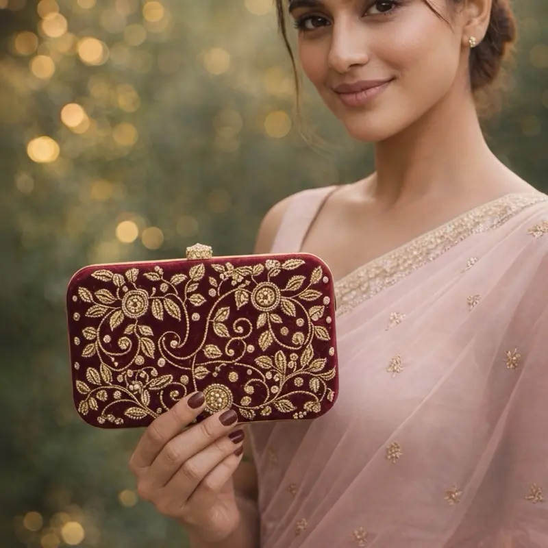 Zardozi Beautiful Red and Gold Clutch with Beads Work, Elegant Design, Perfect for Special Occasions