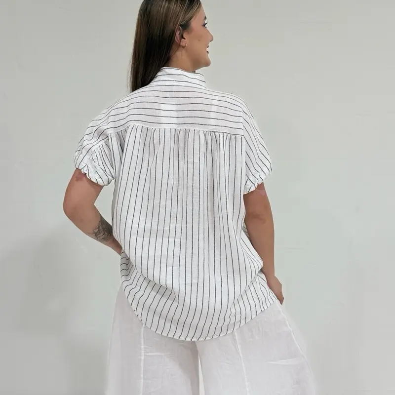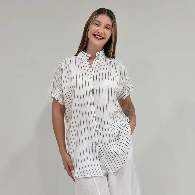 Featuring subtle vertical stripes, natural shell buttons, and a soft structured collar, this shirt blends timeless European style with a modern Ibiza inspired look. The slightly longer curved back adds flow and movement, making it flattering both tucked in or worn loose.