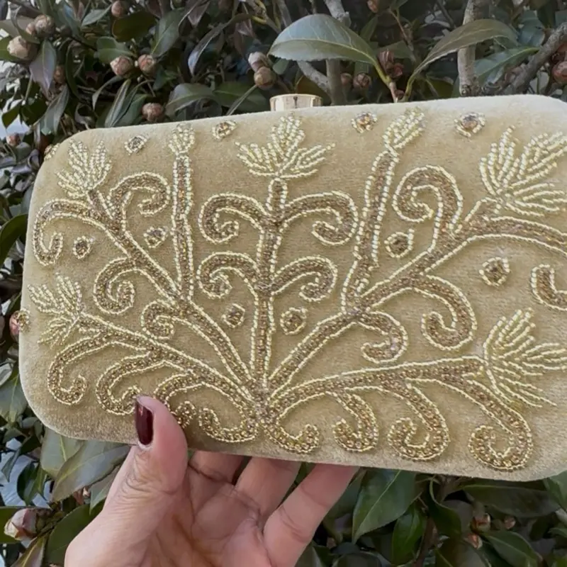 Beautiful medium size clutch adorned with zardozi embroidery and beads. Comes with a detachable strap and a gold handle. Gold champagne color