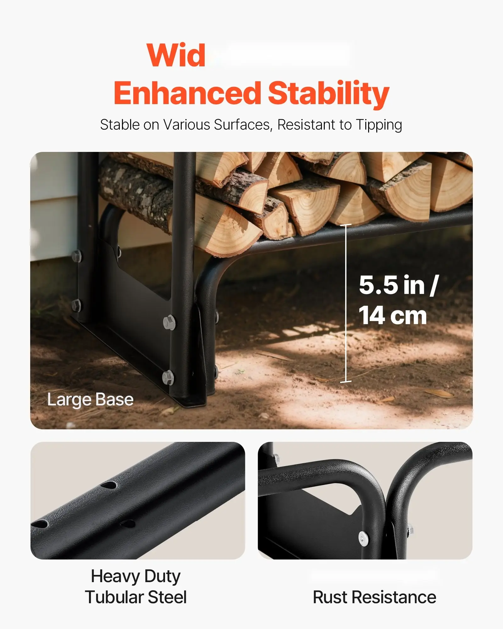 ·Reinforced Wide Base: Unlike standard single-bar bases, our upgraded wide-frame base offers enhanced balance and strength. The outdoor wood rack stands firm on uneven surfaces and is less likely to tip over in harsh wind or heavy snow, offering a more secure solution for long-term wood storage.