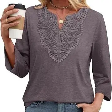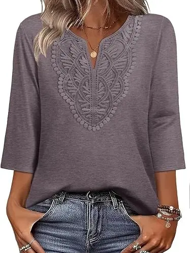 ·Fashion Design--The elegant shirts for women feature a classic V-neck and 3/4 sleeves with a gorgeous lace front for a feminine touch. The flattering, slimming curved hem gracefully covers hips and belly,perfect for both casual and formal wear, easily dressed up or down.