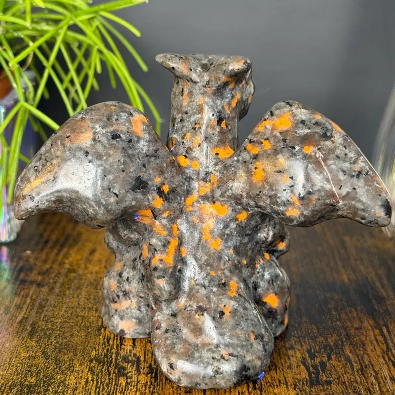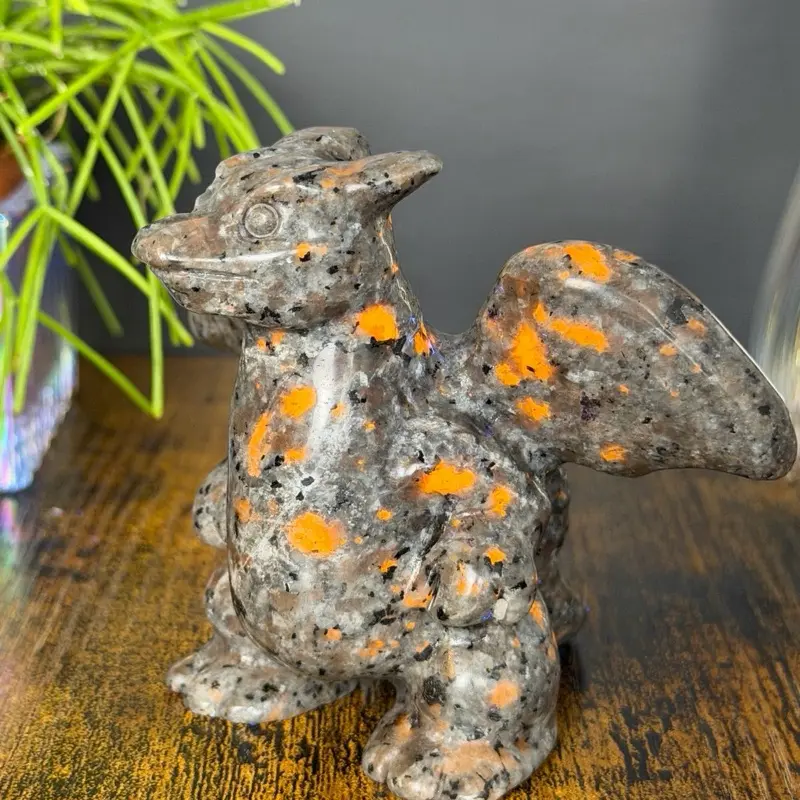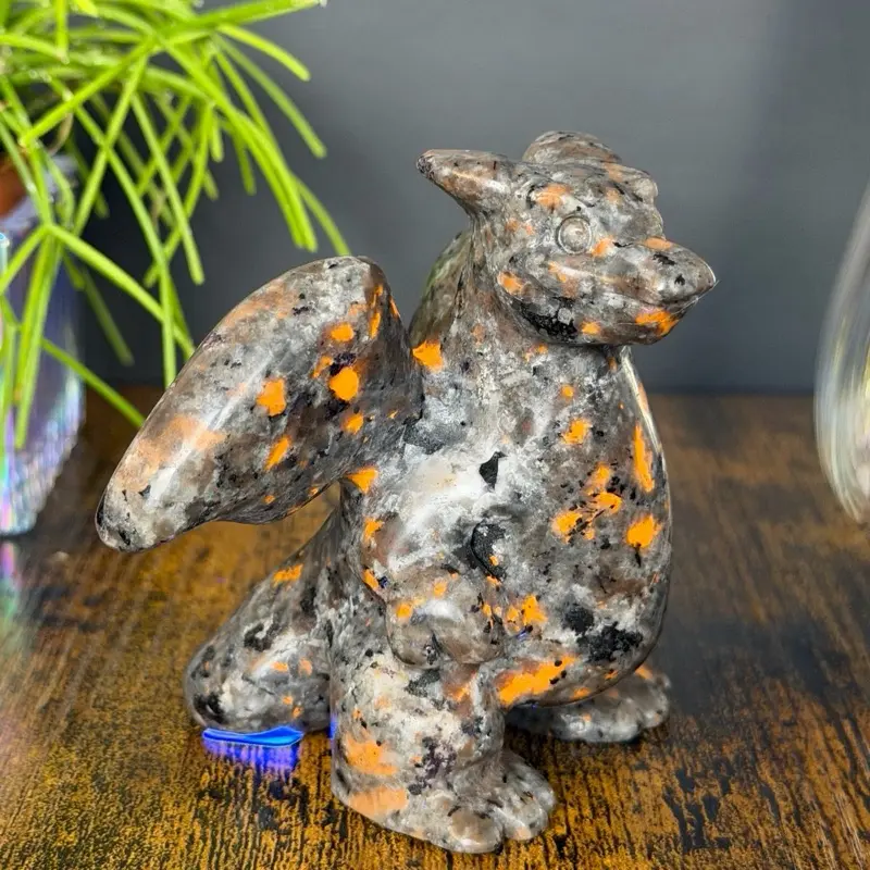This bold Charizard carving is made from yooperlite, a unique stone composed of sodalite within syenite. In normal lighting, it features a natural mix of gray, black, and earthy tones—but under UV/black light, the sodalite fluoresces a fiery orange glow, creating an eye-catching, almost molten effect throughout the piece.