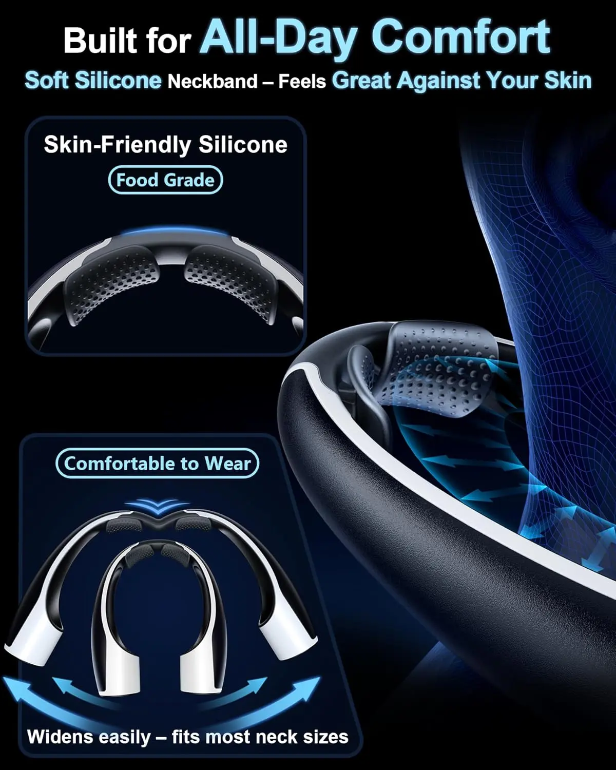 ·Soft Silicone Padding for Comfort – Designed for extended wear, the Rohent Q1 features soft silicone material on the neckband, ensuring maximum comfort. The ergonomic fit prevents slipping and reduces pressure, making it ideal for long commutes, workouts, or daily errands