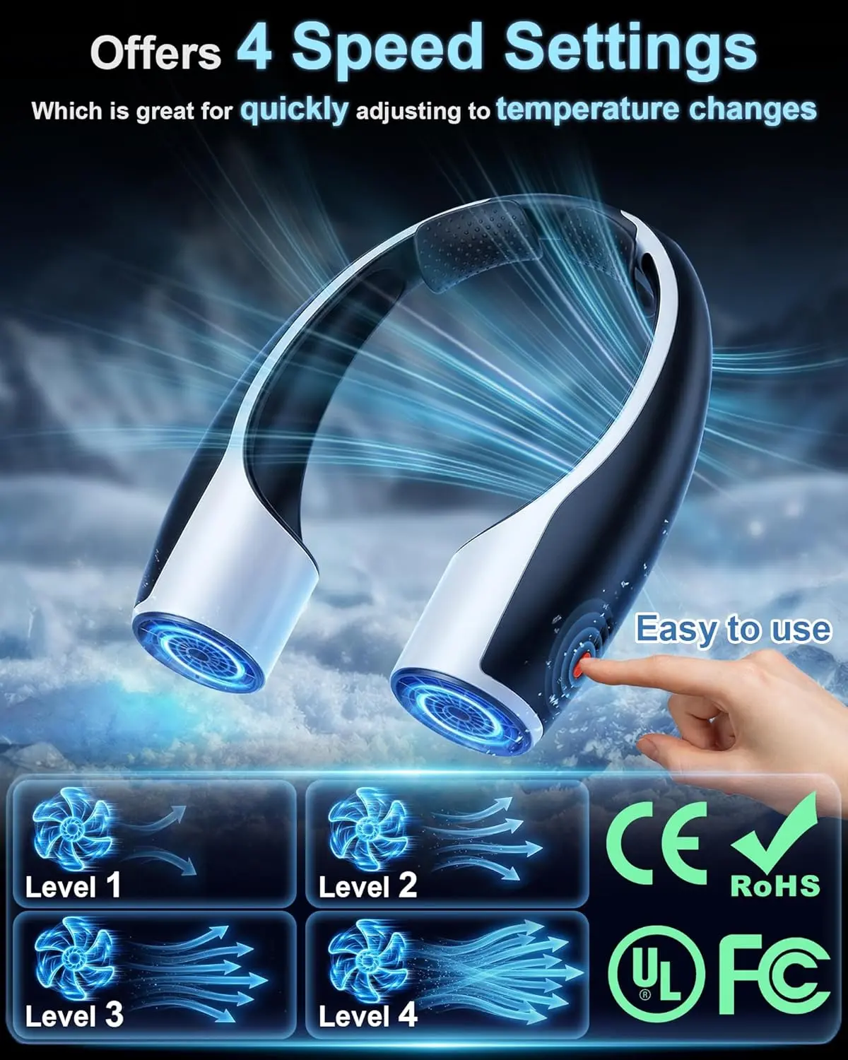 ·4 Adjustable Speed Settings – Customize your cooling experience with 4 speed levels, ranging from a gentle breeze to strong airflow. The Rohent Q1 adapts to your needs, whether you're relaxing indoors or battling high temperatures during outdoor adventures