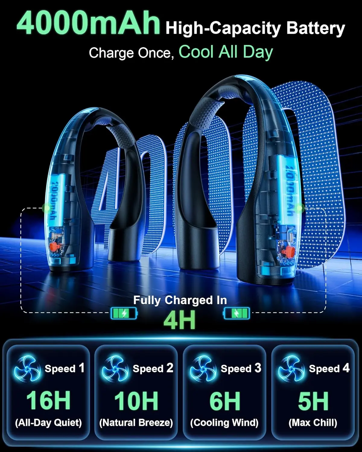 · How long does the battery last on a single charge? The neck fan is equipped with a powerful 4000mAh battery, providing between 5 and 16 hours of cooling, depending on the selected speed setting. This means you can enjoy hours of continuous comfort, perfect for work, travel, or outdoor activities.