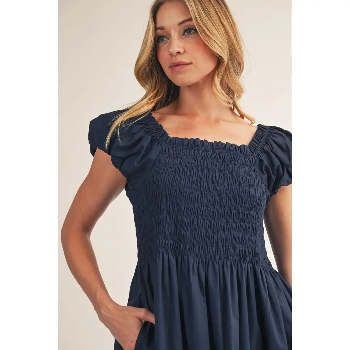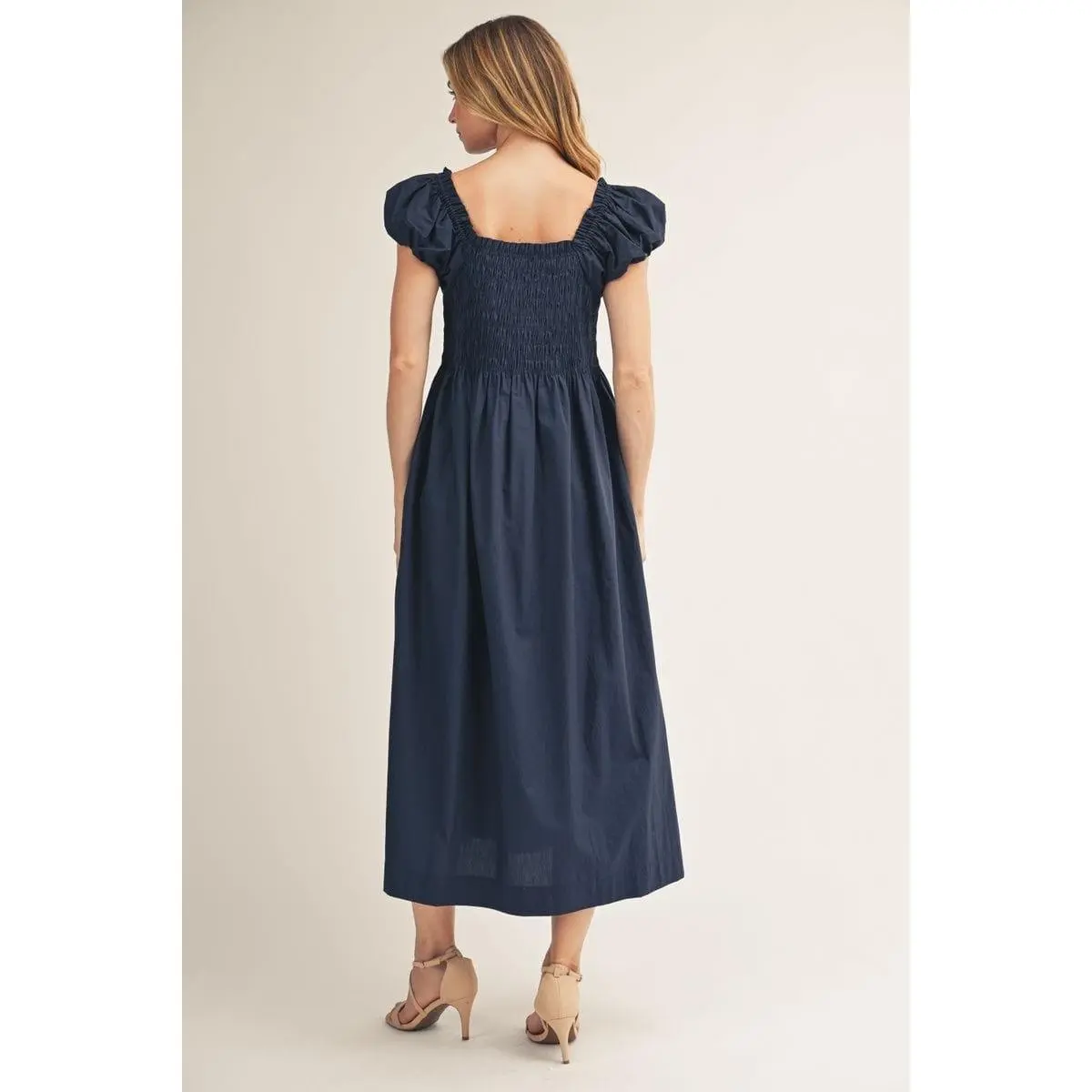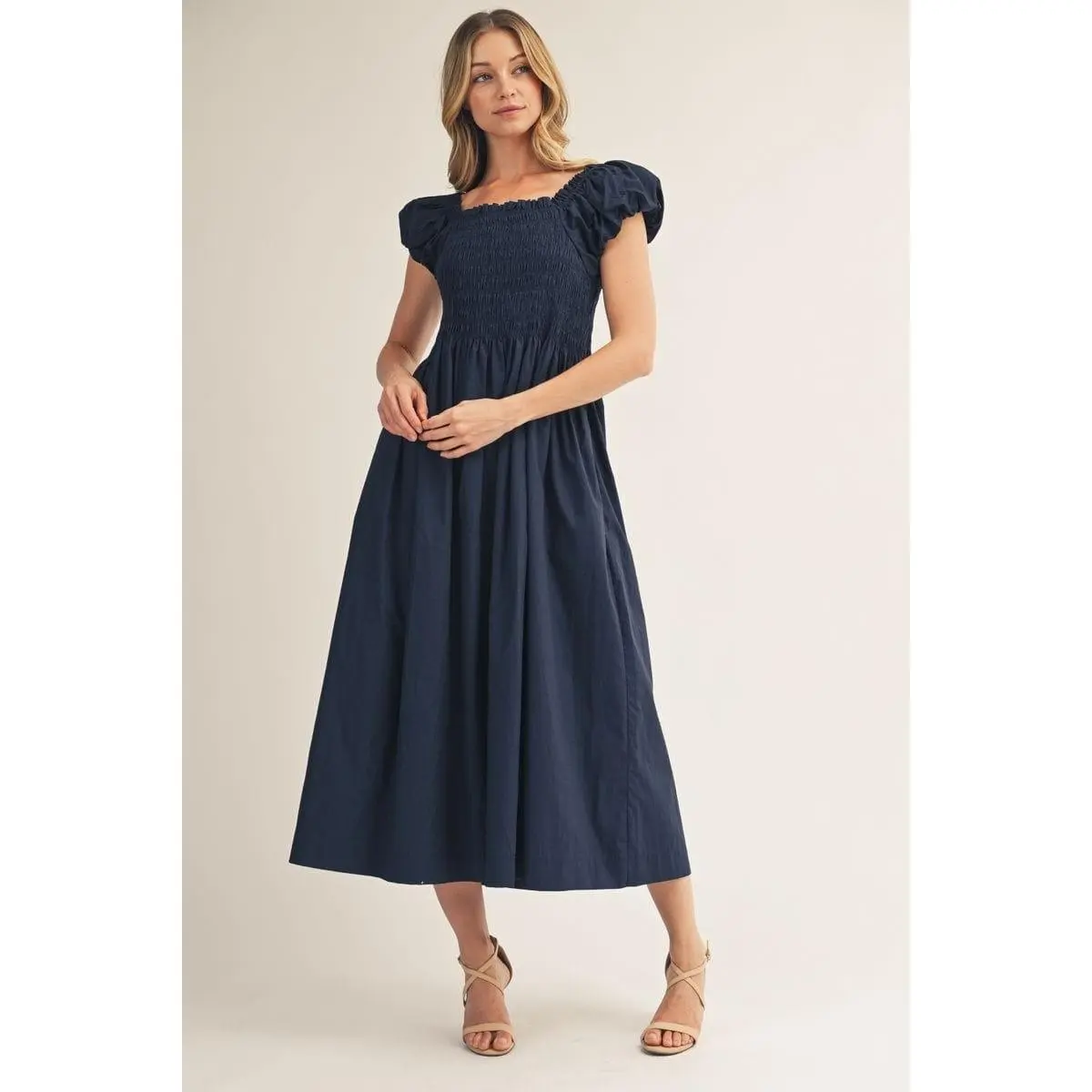 Featuring voluminous puffed cap sleeves and a smocked bodice that hugs your curves beautifully, this piece delivers both style and comfort. The solid color keeps it classic and easy to style, while the midi cut provides sophisticated coverage. Whether you're heading to brunch or a casual dinner, this dress effortlessly bridges the gap between relaxed and refined. A wardrobe essential for anyone who values quality and timeless appeal.
