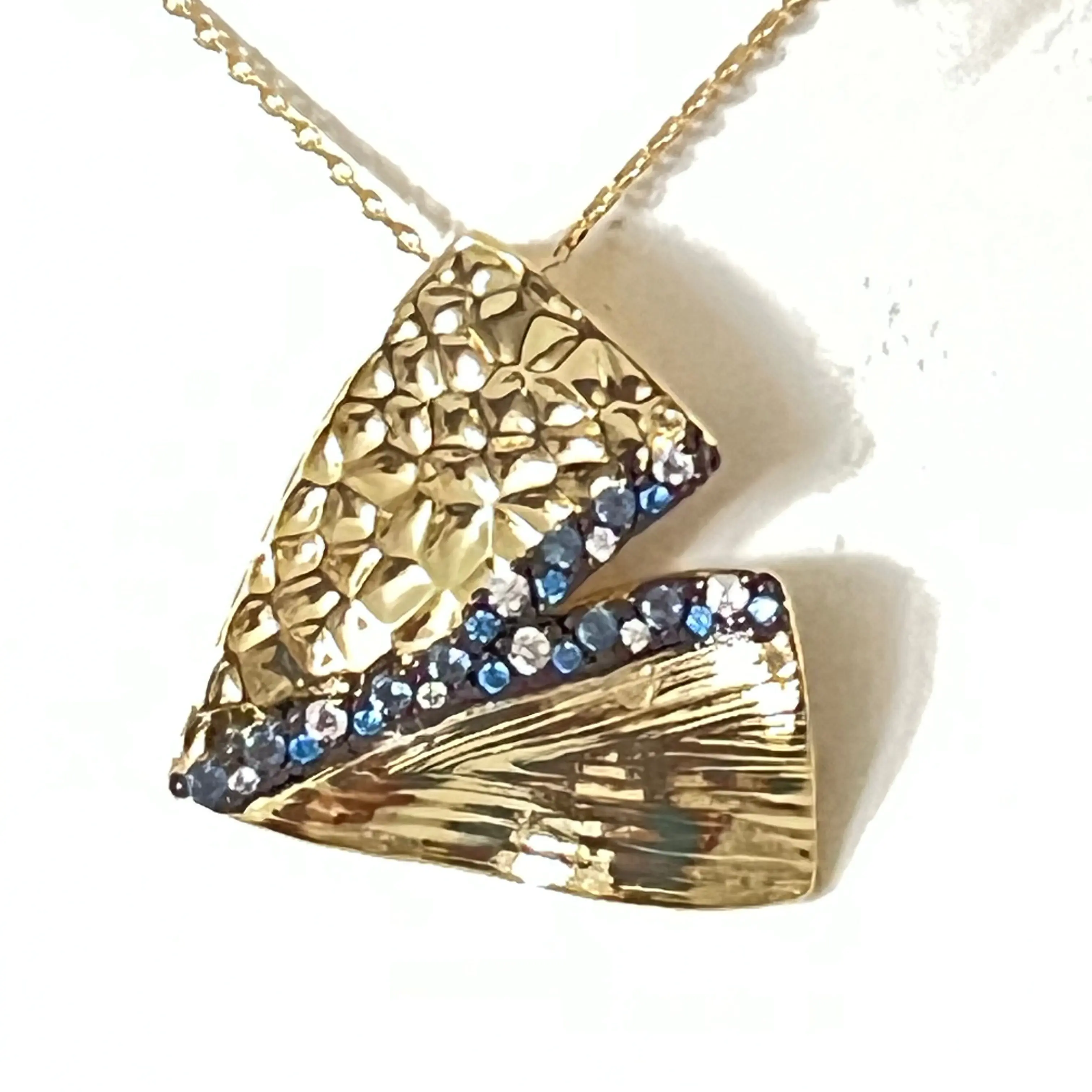 Bold yet refined, the Ocean Crest Pendant features a sculpted, spearhead-shaped design crafted in a tarnish-free gold-tone alloy. The pendant combines contrasting textures—one side hammered, the other brushed—with a graceful sweep of blue and clear stones that evoke the shimmer of ocean waves. Suspended from a dainty 16" chain with a 2" extender and secure lobster clasp, this piece brings effortless elegance and a splash of color to any look.