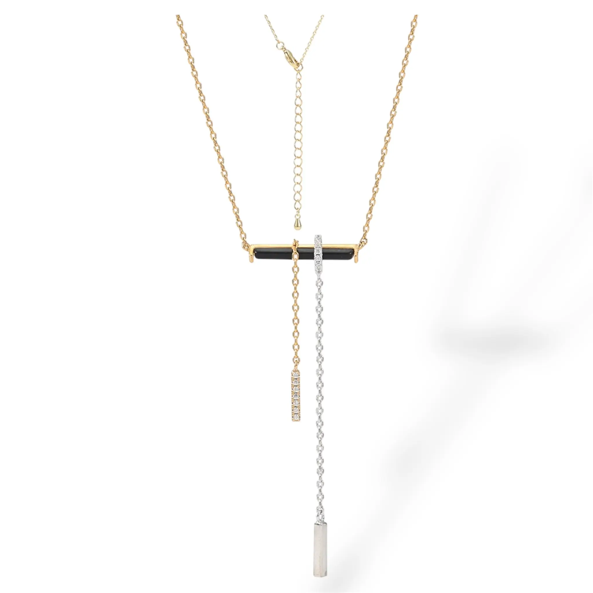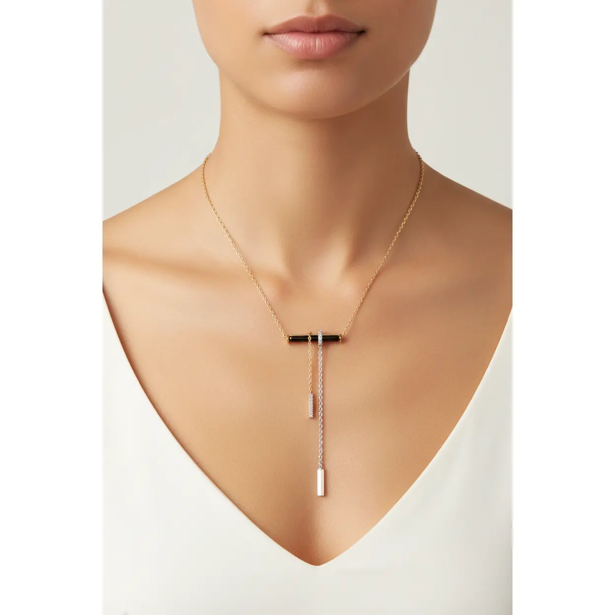 The Midnight Duality Necklace is a bold, contemporary piece designed for effortless layering or solo statment wear. Featuring a horizontal black bar stone anchored by contrasting gold and silver-tone chains, this necklace embodies modern minimalism with edge. The sparkling pave charm and sleek silver bar create visual balane and dimension. Crafted with tarnish free, hypoallergenic material, this pice stay radiant and polished wear after wear.