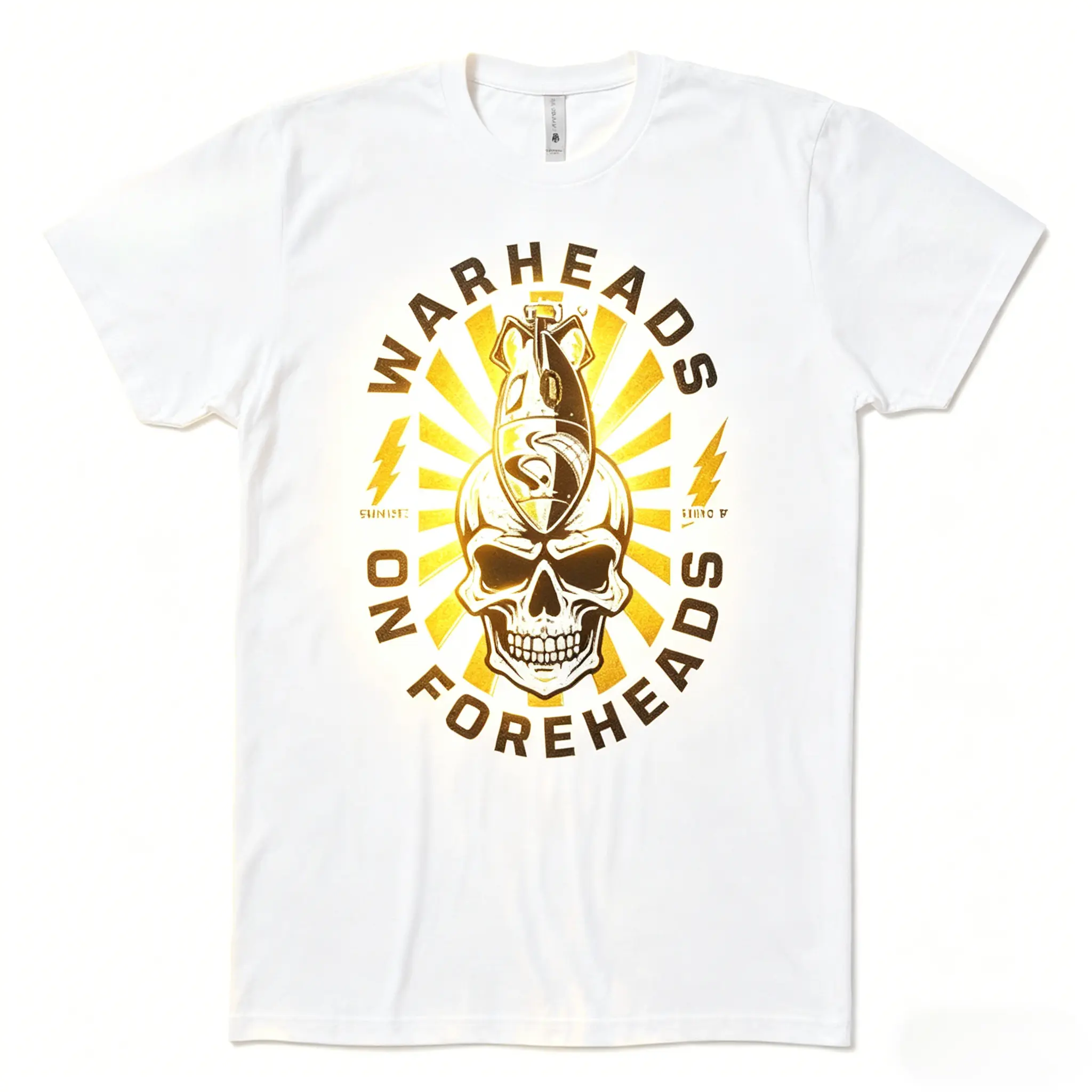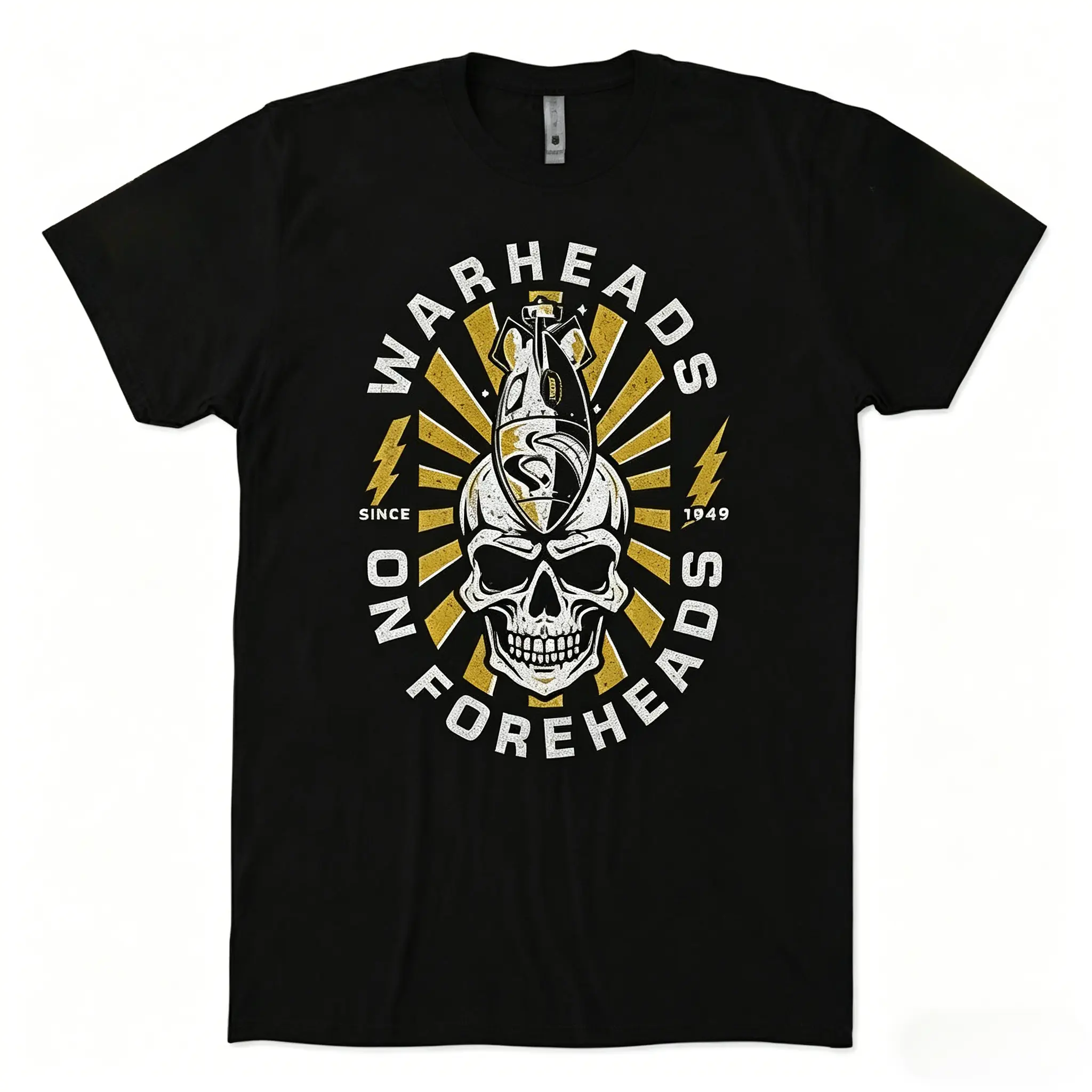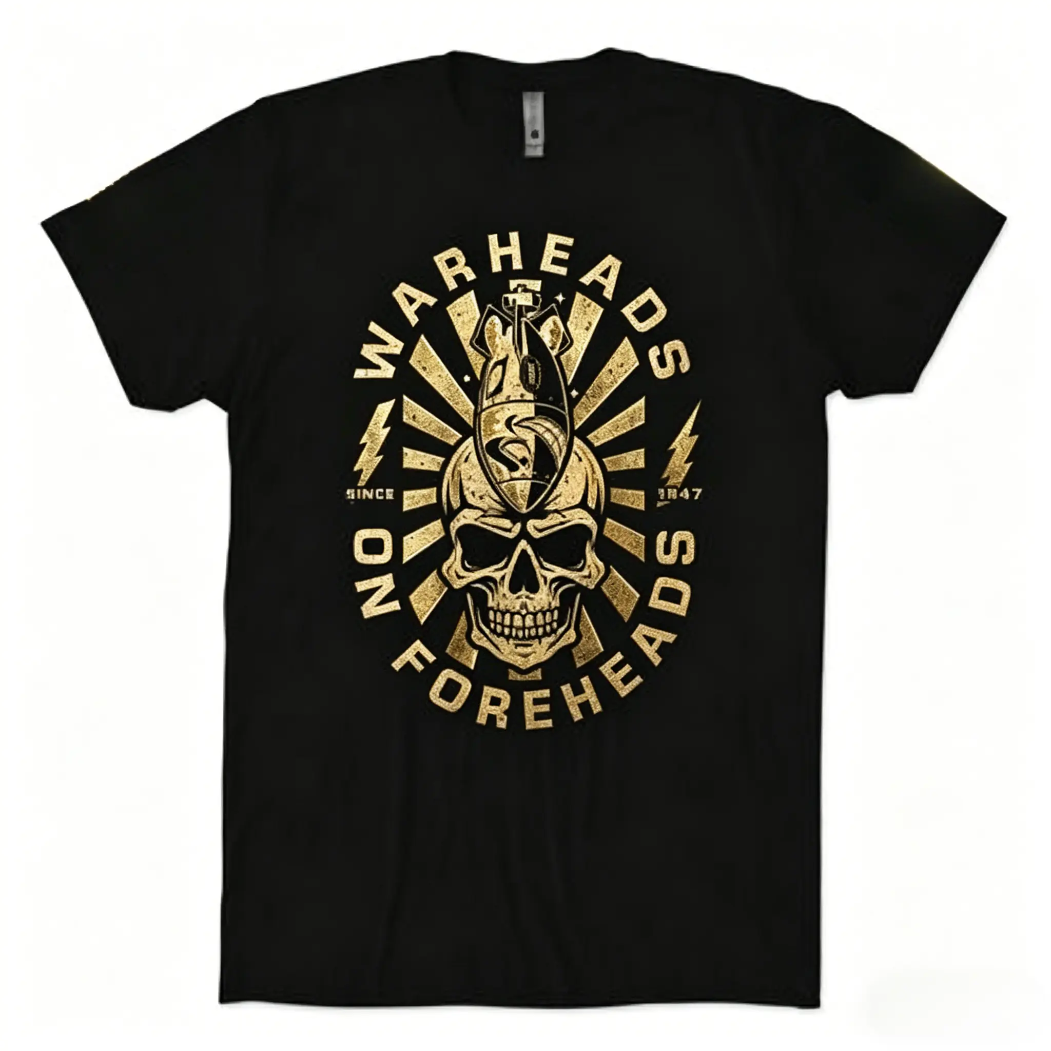 Warheads No Foreheads, Skull With Bomb On Forehead, Distressed Gold Foil Texture, Sunburst Radiant Rays, Military Slogan, Since 1947, Lightning Bolt Accents, Black T-Shirt Print, Veteran Military Apparel, Edgy Streetwear Graphic
