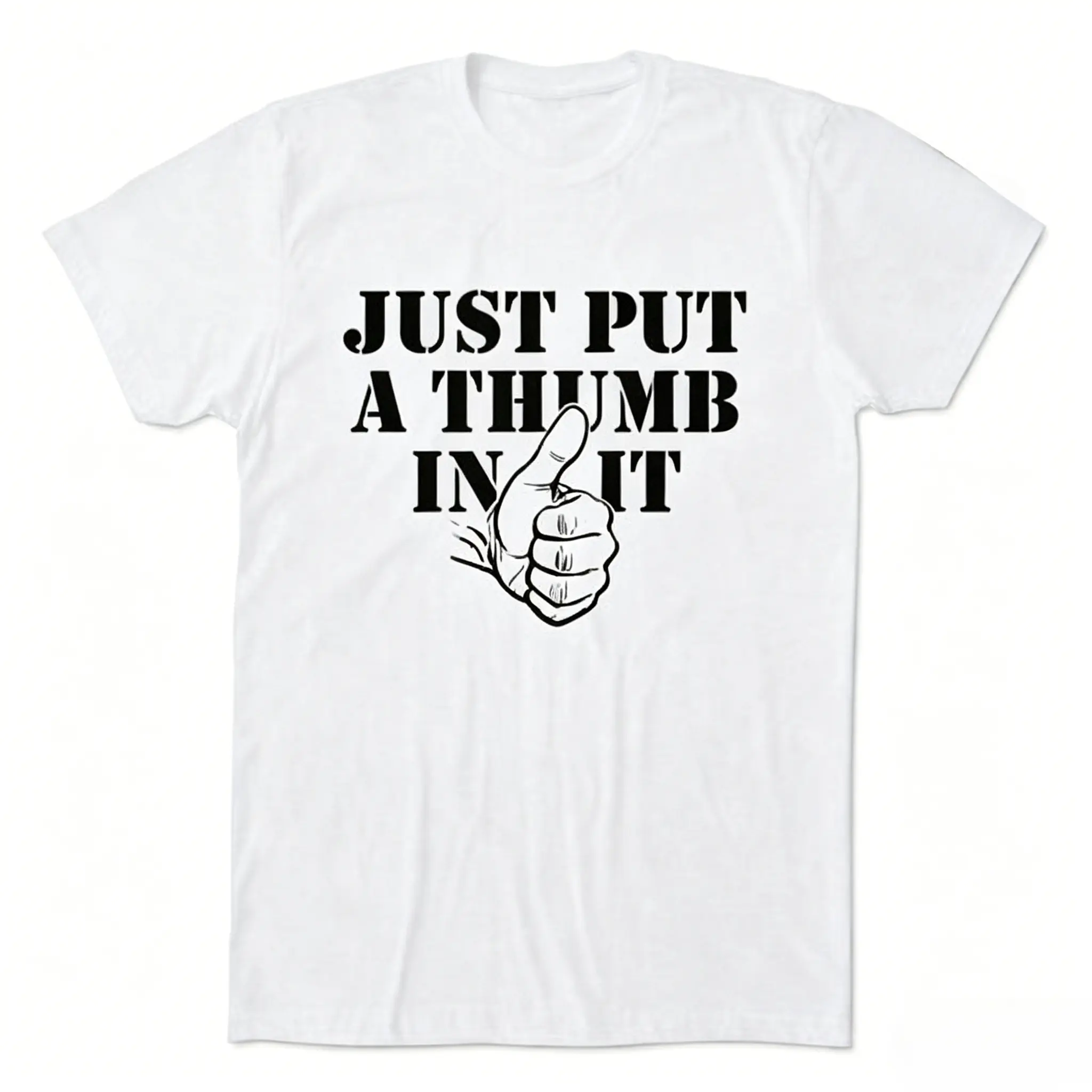 Just Put A Thumb In It, Bold White Serif Text, Thumbs Up Hand Illustration, Adult Double Entendre Humor, Black T-Shirt Print, Funny Meme Apparel, Rude Joke Streetwear, Gag Gift Graphic