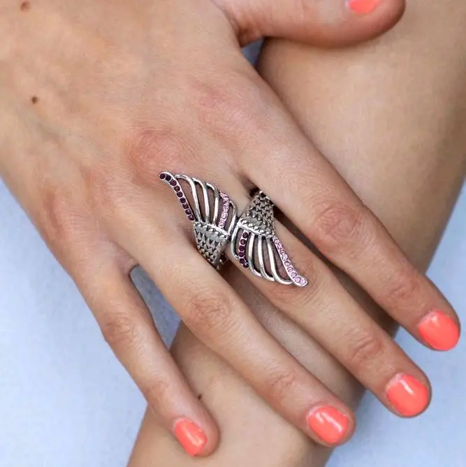 Featuring lifelike feathery detail, two airy silver wings delicately wrap around the finger. Rows of dainty purple and pink rhinestones adorn the winged accents, adding a celestial shimmer to the angelic centerpiece. Features a stretchy band for a flexible fit.