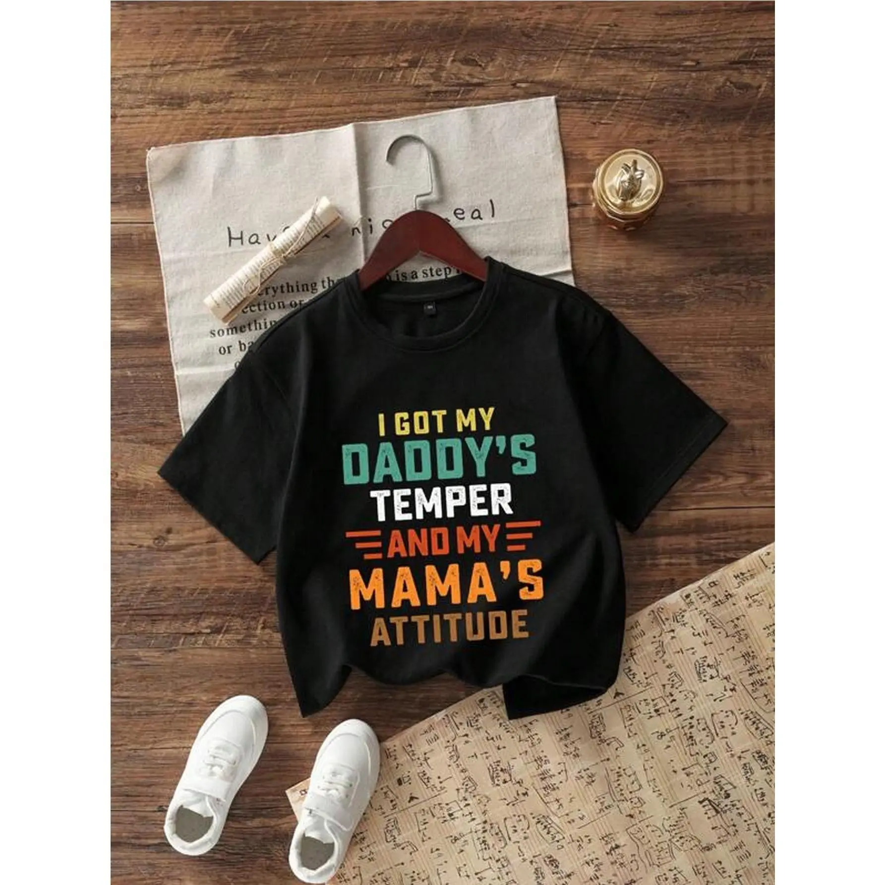 Boys' Funny "I Got My Daddy'S Temper & My Mama'S Attitude" Print T-Shirt - Casual Round Neck Short Sleeve Tee with Slogan, Comfortable Casual Attire for Kids 3-13 Years, Father'S Day Gift Idea, Family Matching Outfits ( with Green & Red Lettering)