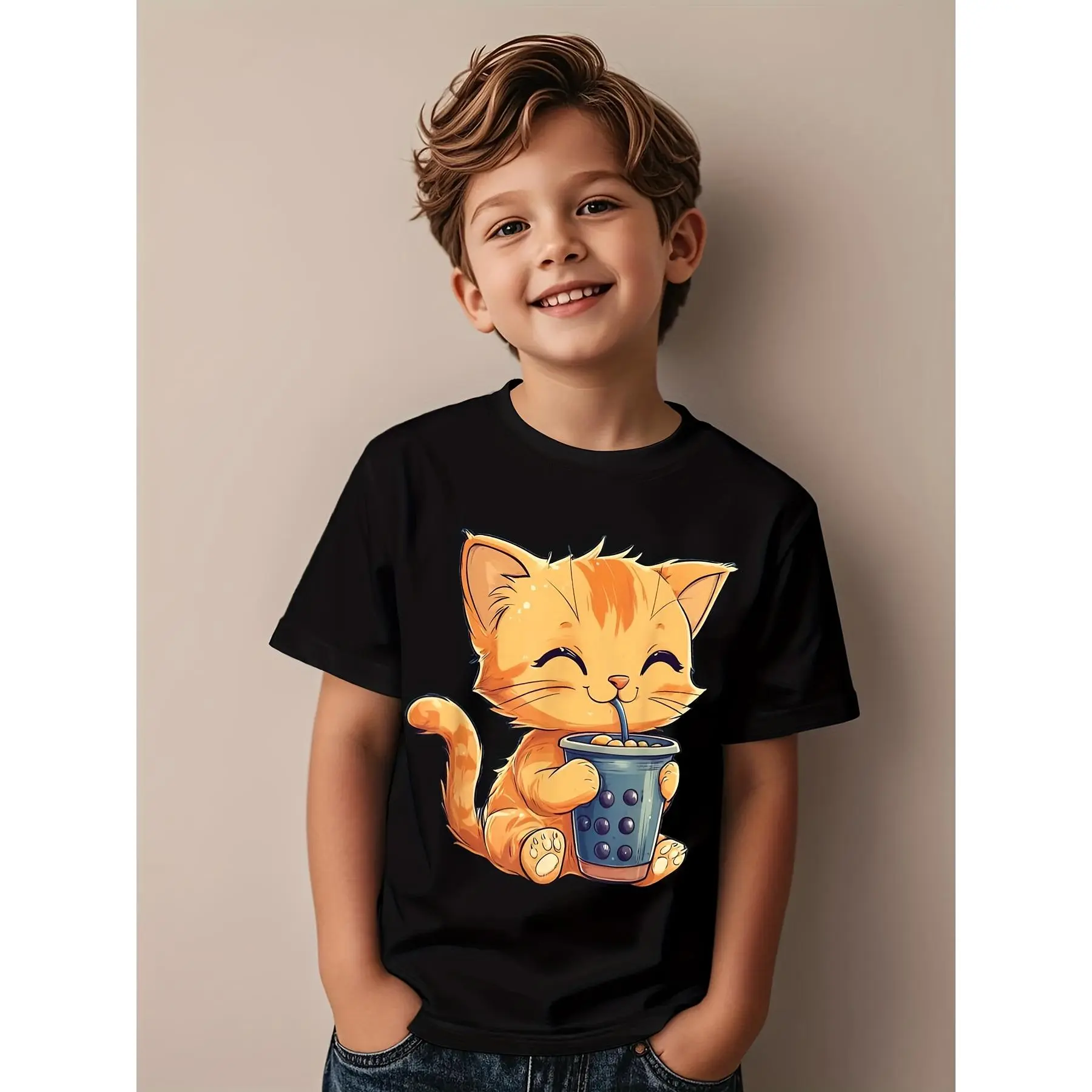 Cute Cartoon Orange Kitten Graphic T-Shirt for Boys Black Tee with Playful Cat Drinking Bubble Tea Design Perfect for Summer Fun and Casual Attire
