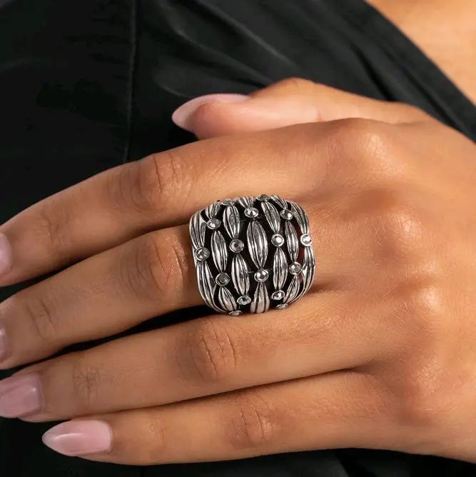Textured rows of silver, interrupted in an orderly manner by dainty hematite rhinestones, wrap around the finger for a fiercely stacked centerpiece. Features a stretchy band for a flexible fit.