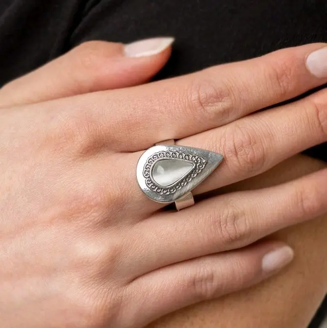 A white cat's eye teardrop creates a glowing centerpiece inside a silver teardrop frame. A border of lacy detail is embossed around the colorful center, adding intricate detail to the design as it sits boldly atop the finger. Features a dainty stretchy band for a flexible fit.